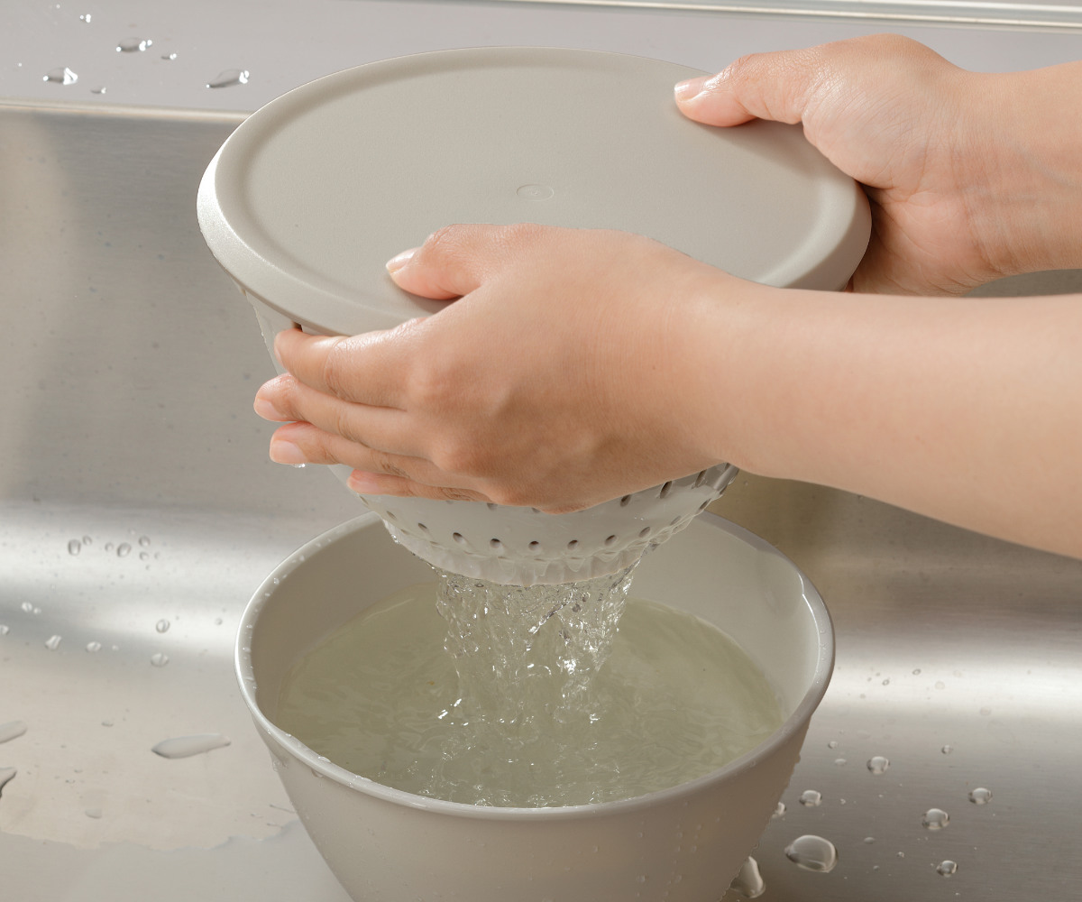 フタがあることで中身が飛び出る心配がなく、ザルを振ってしっかり水切りできます。