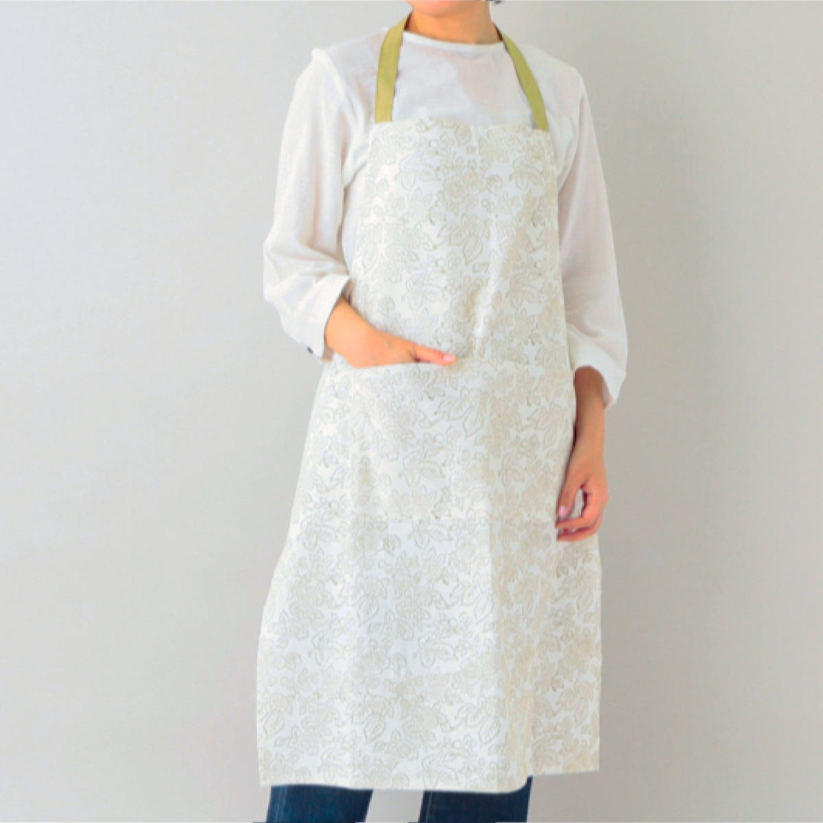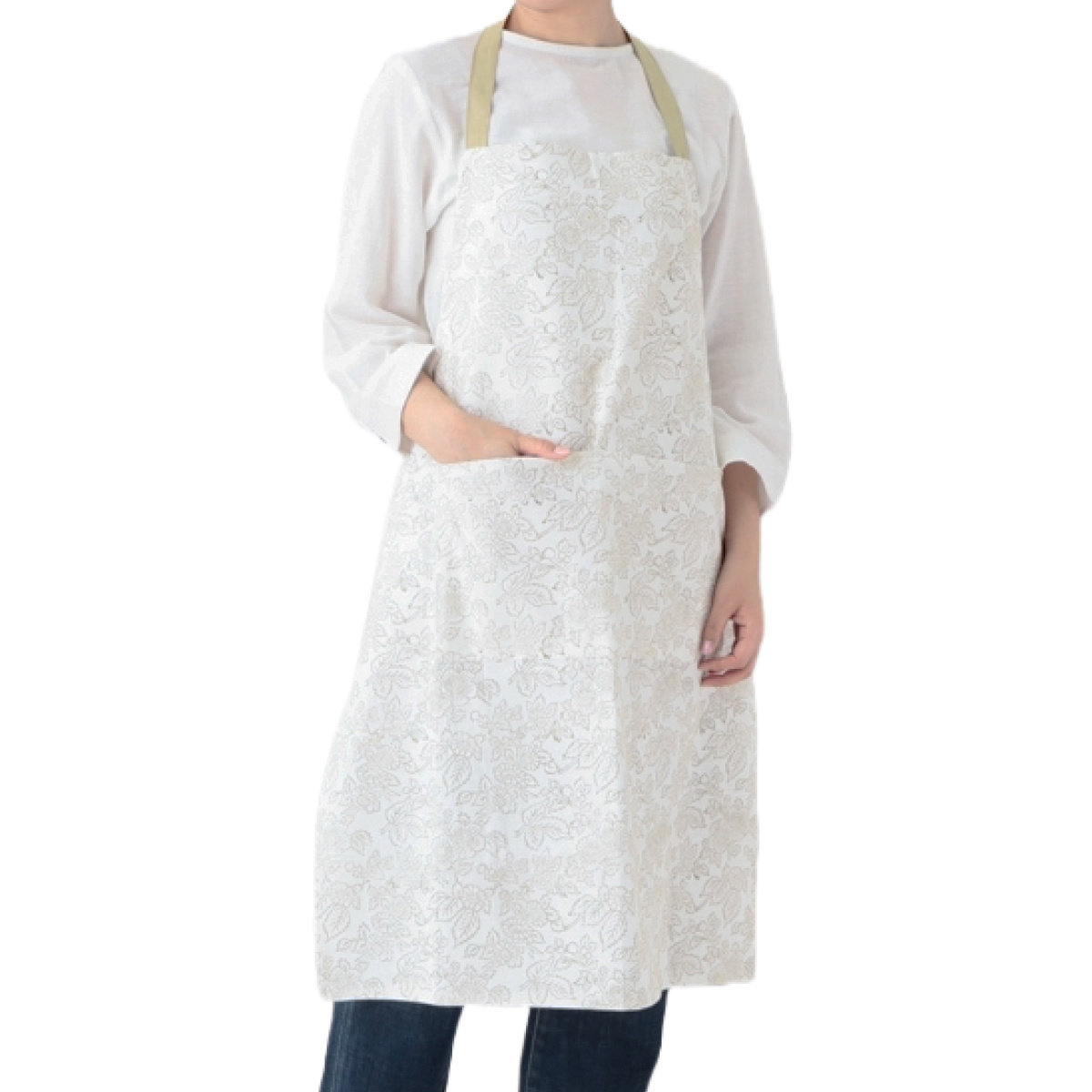落ち着いた色合いで主張しすぎず、キッチンやインテリアにも自然になじみます。程よい丈感で動きやすく、調理や洗い物などの作業も快適に行えます。