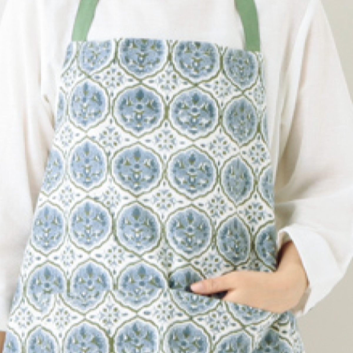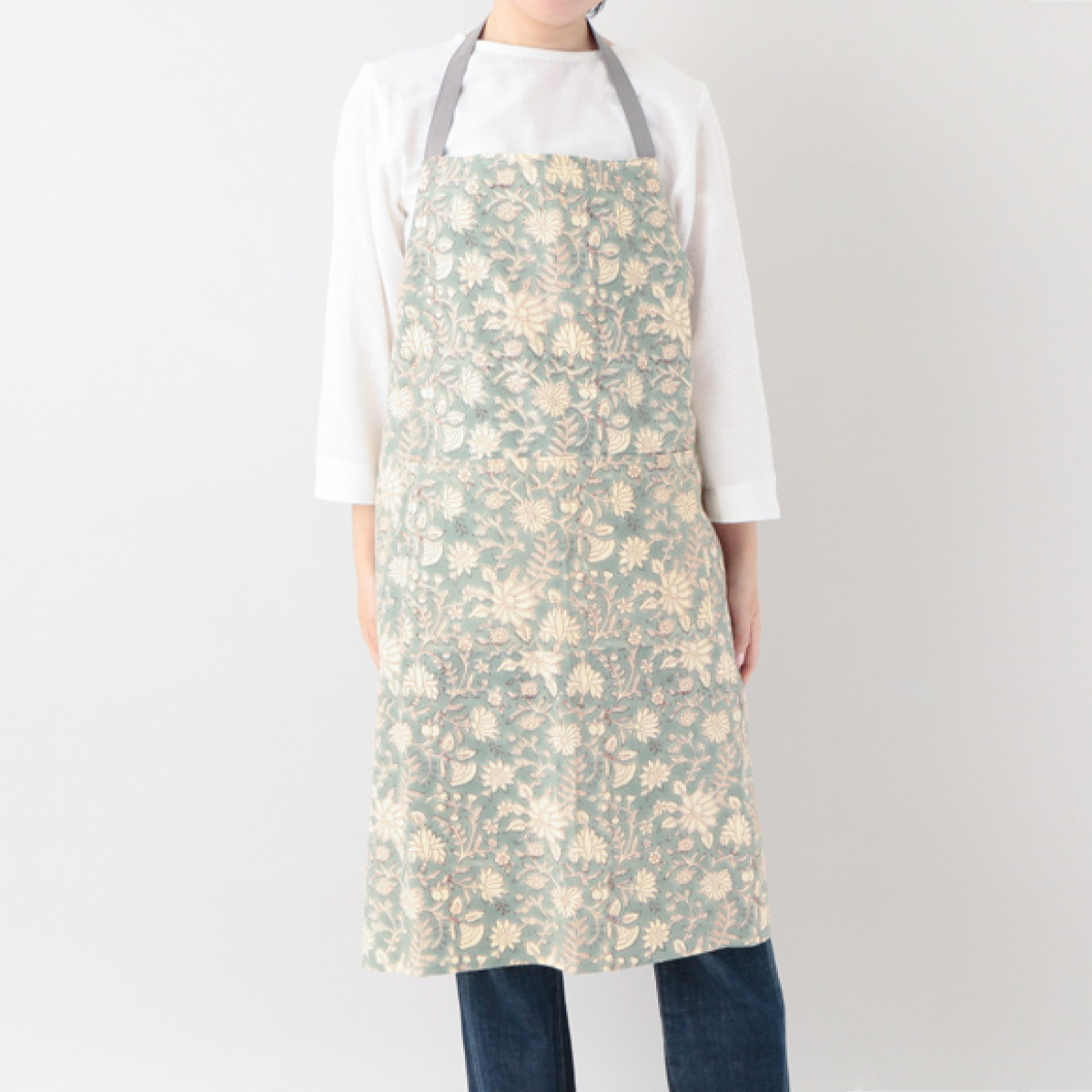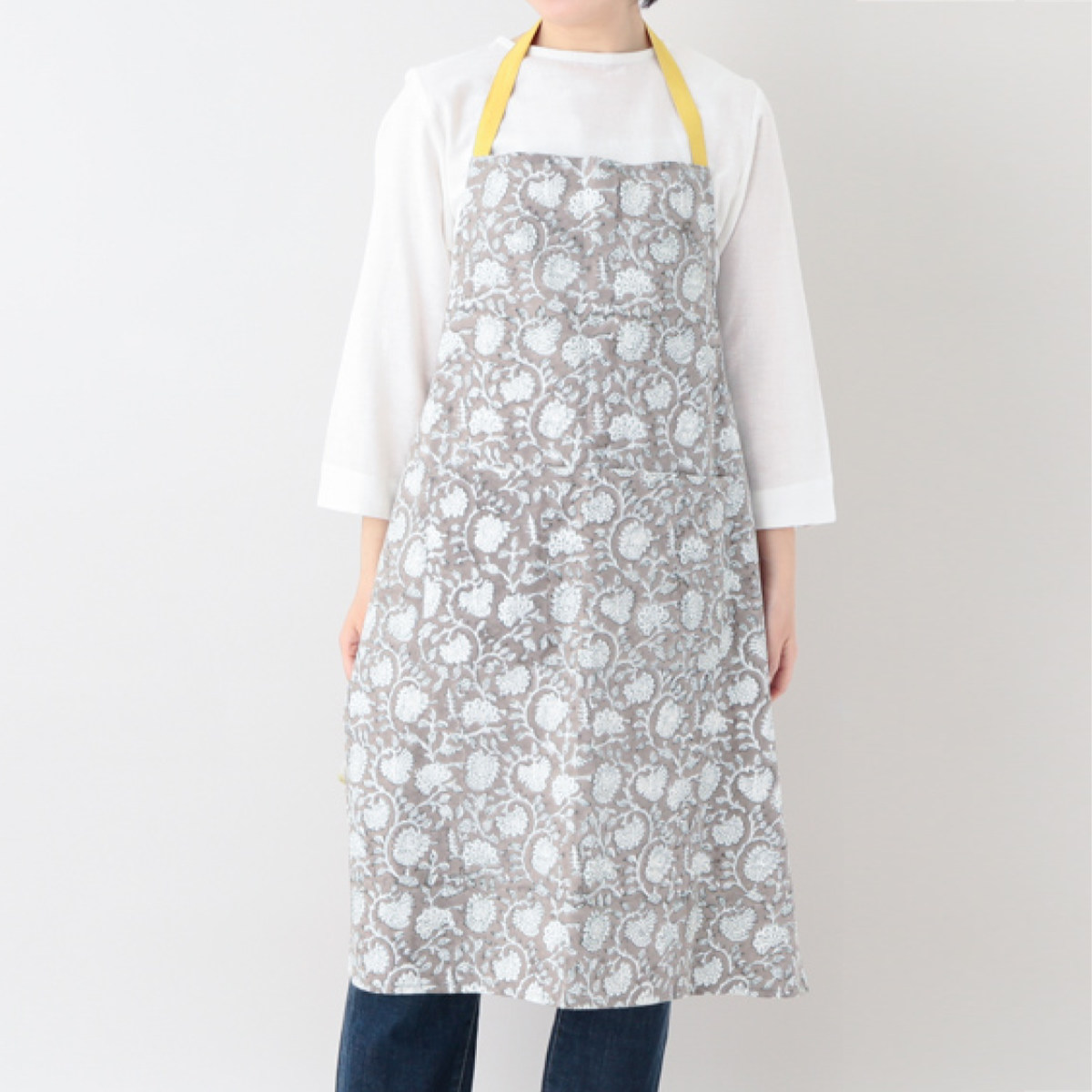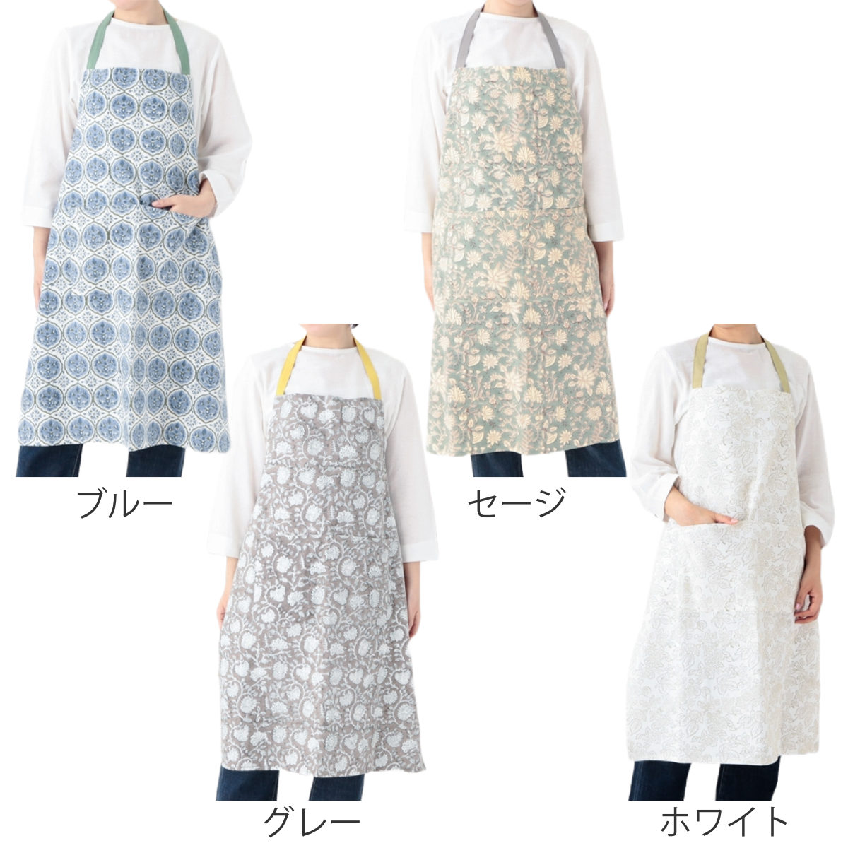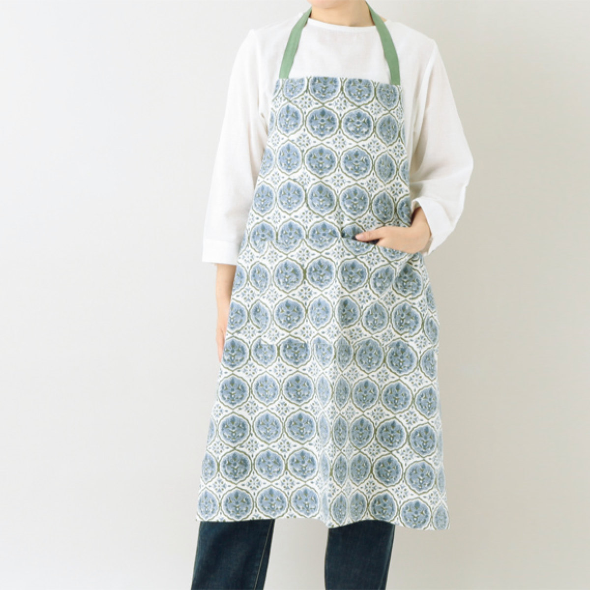インドで親しまれている染色技法、ブロックプリントによって仕立てられたエプロンです。手彫りの木版を用いた伝統技法で、機械では出せないハンドメイドならではの優しい風合いが魅力です。