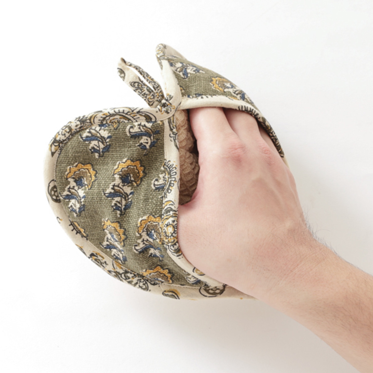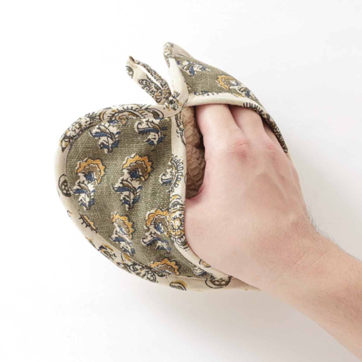 ブロックプリント調のスクリーンプリントを、凹凸のあるラフな素材感が特徴のスラブ生地にプリントして仕上げたファブリックシリーズの鍋掴みです。異なる柄を組み合わせた表情豊かなデザインは、キッチンや食卓の程よいアクセントとして空間を引き立てます。