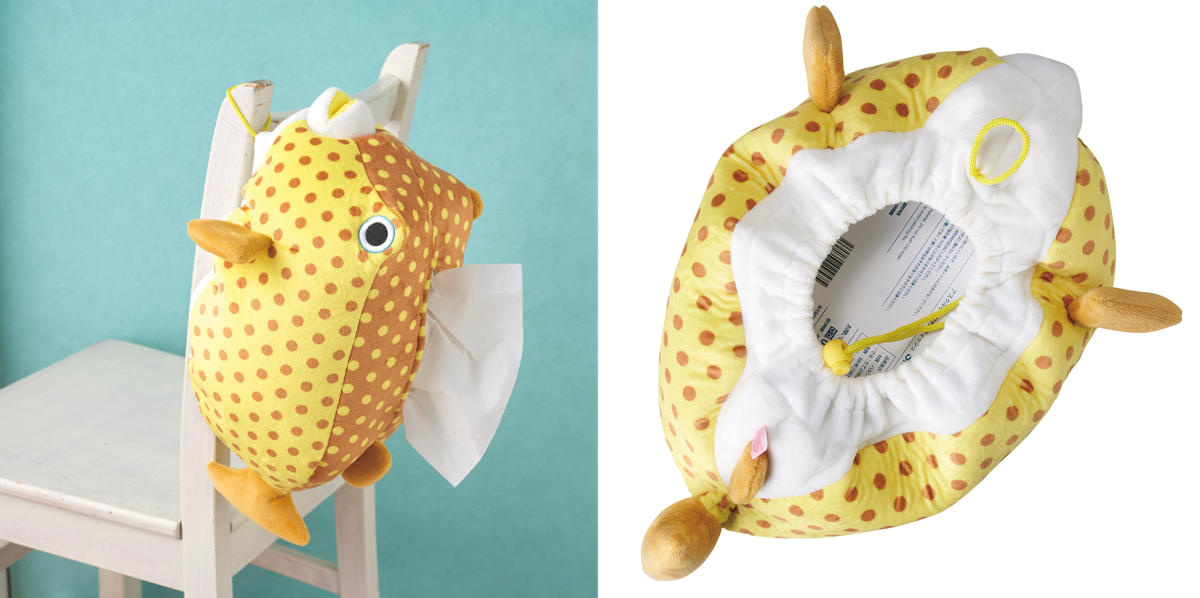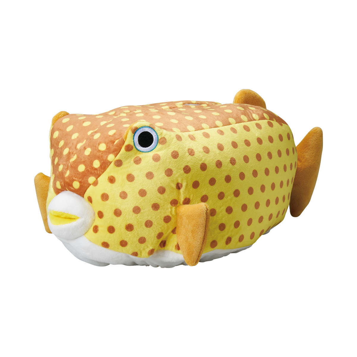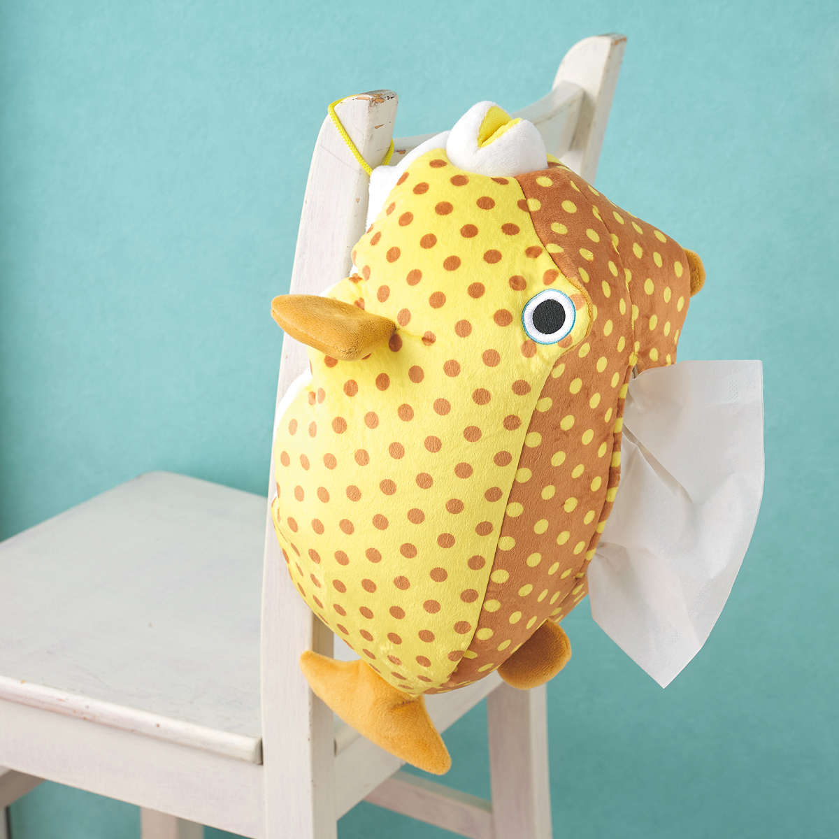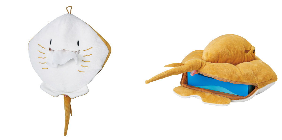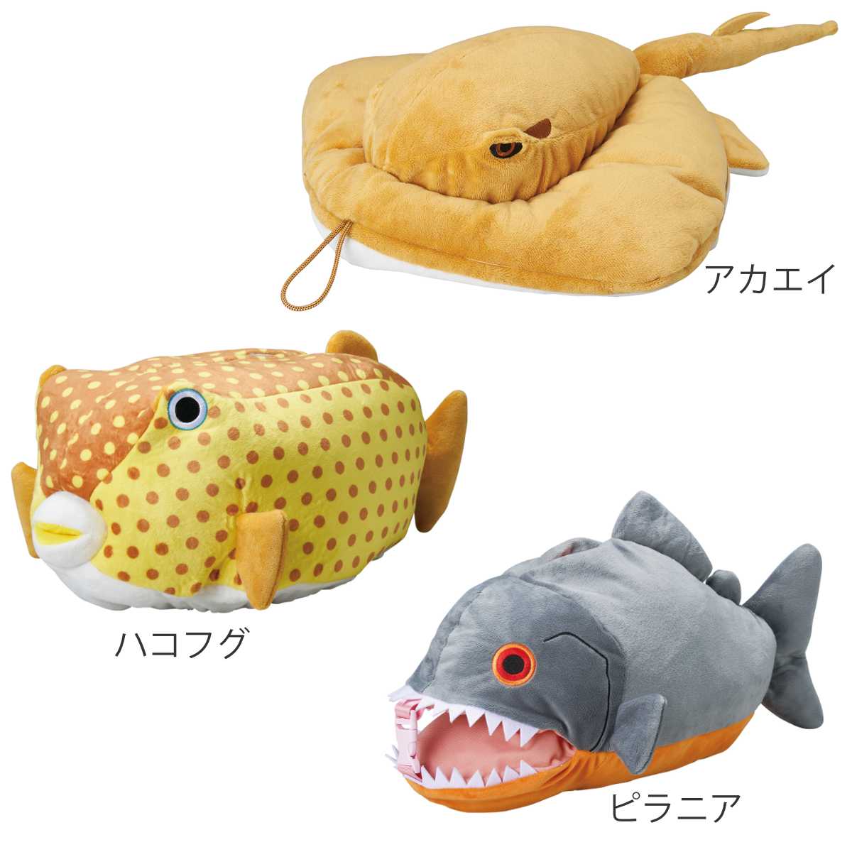 アカエイ・ハコフグ・ピラニアをモチーフにした、ぬいぐるみのようなボックスティッシュケース。それぞれの生き物らしい個性を活かしたデザインで、置いても掛けても空間のアクセントになります。