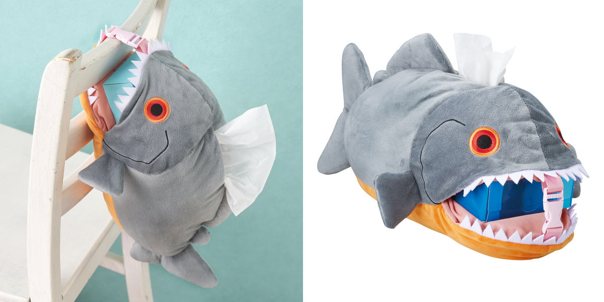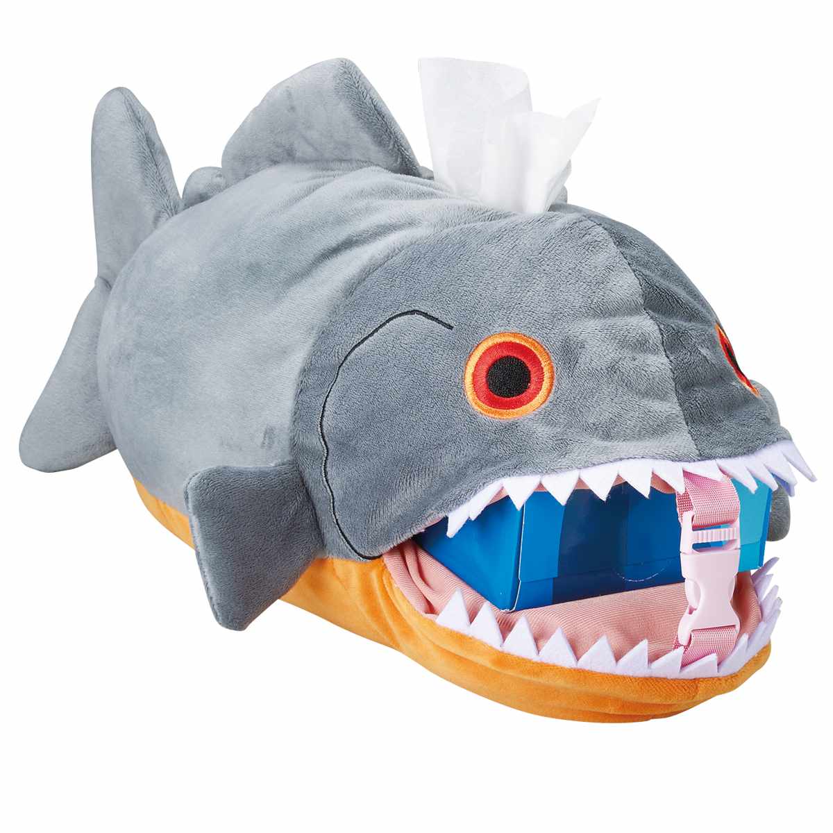 口を開けて、ボックスティッシュを入れるだけの簡単セット。遊び心と使いやすさを両立しています。