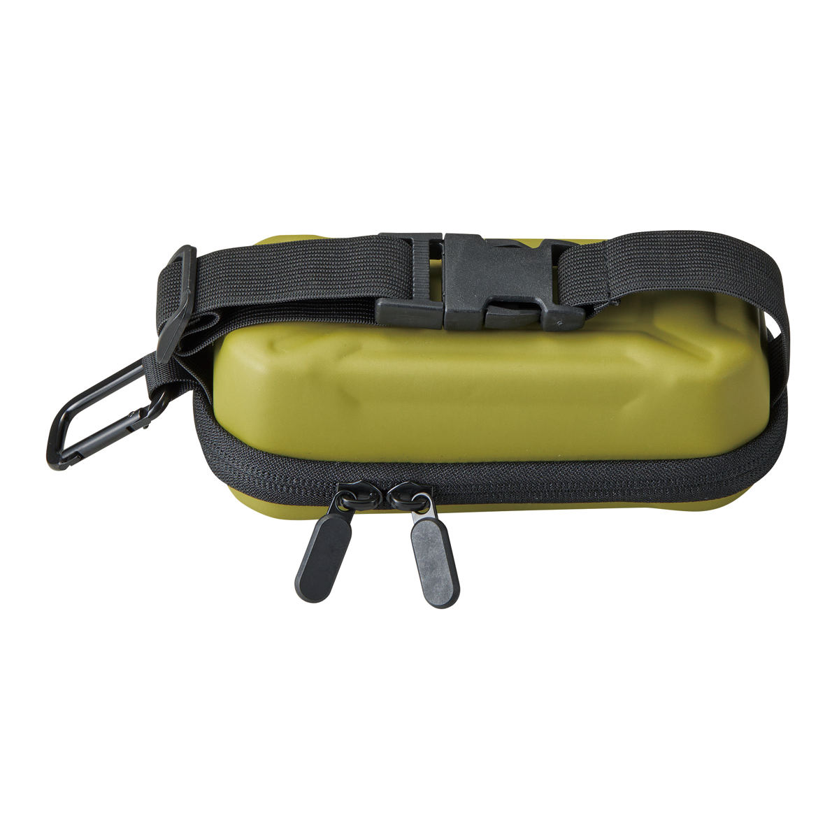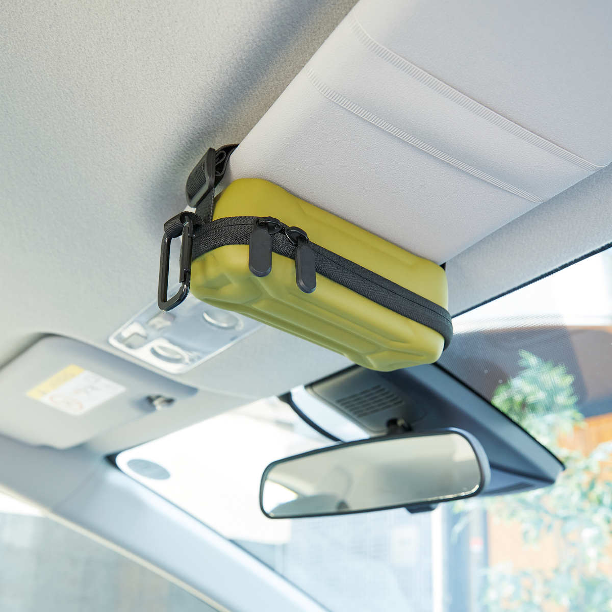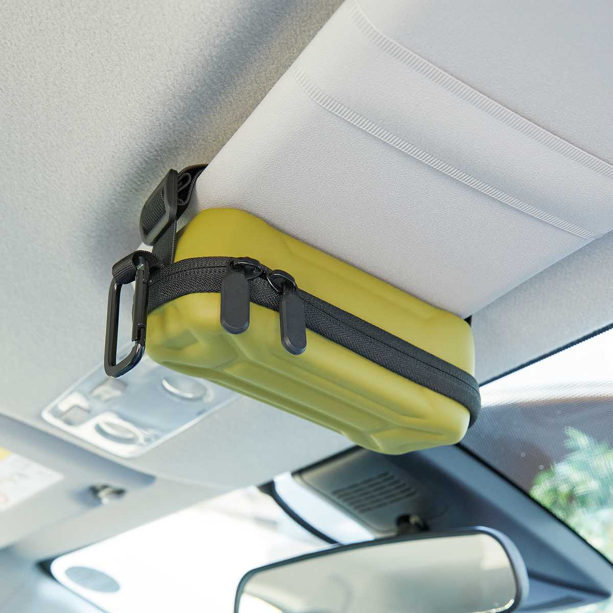 バックルとカラビナ付きで、バッグやベルトループへの装着が可能。車内ではサンバイザーに固定でき、移動中もスマートに持ち運べます。