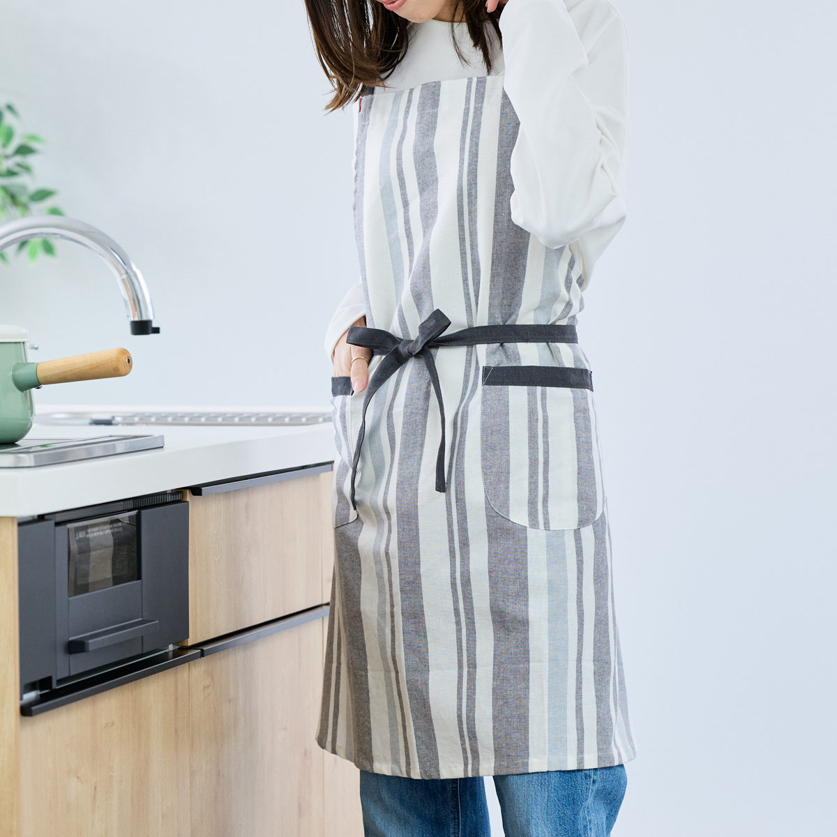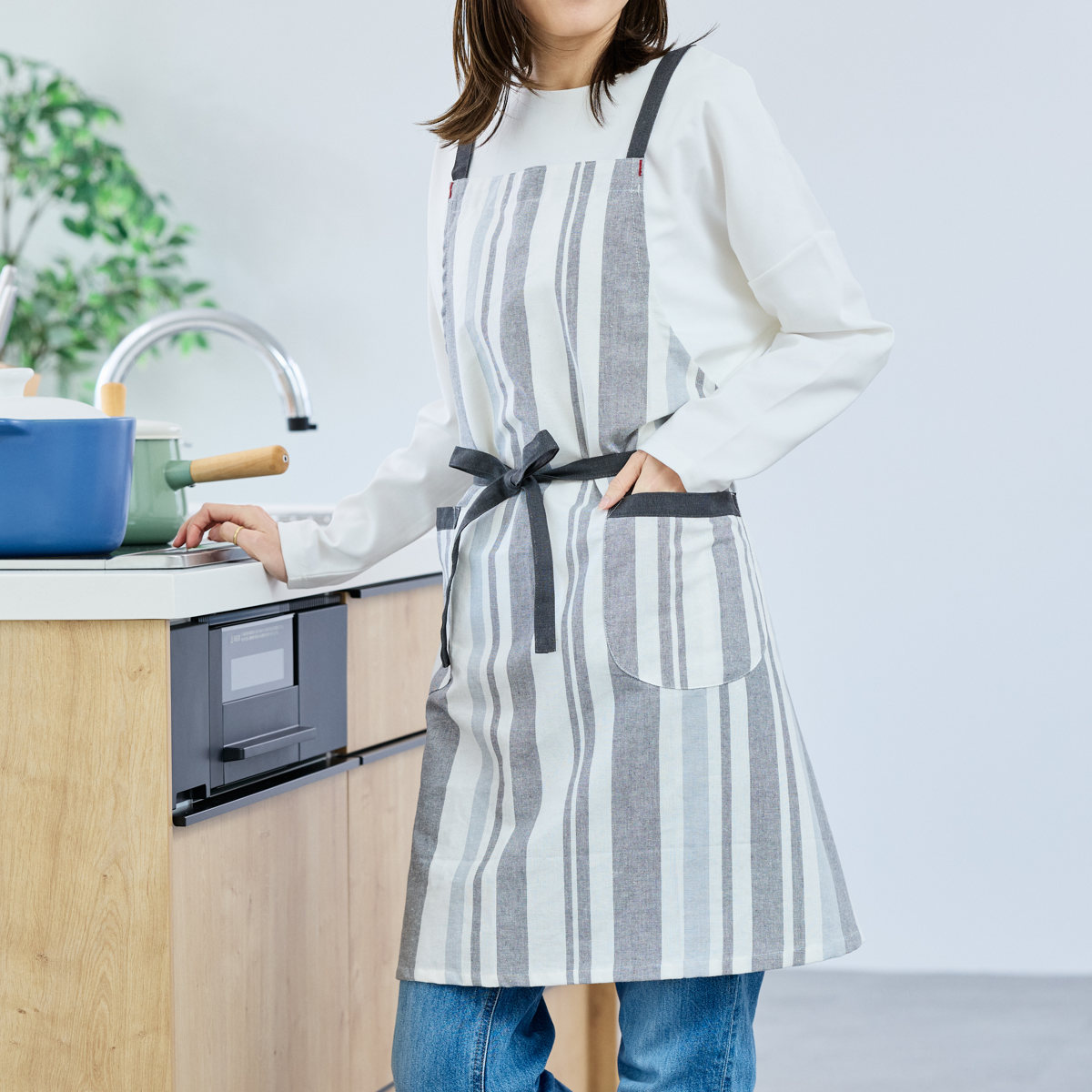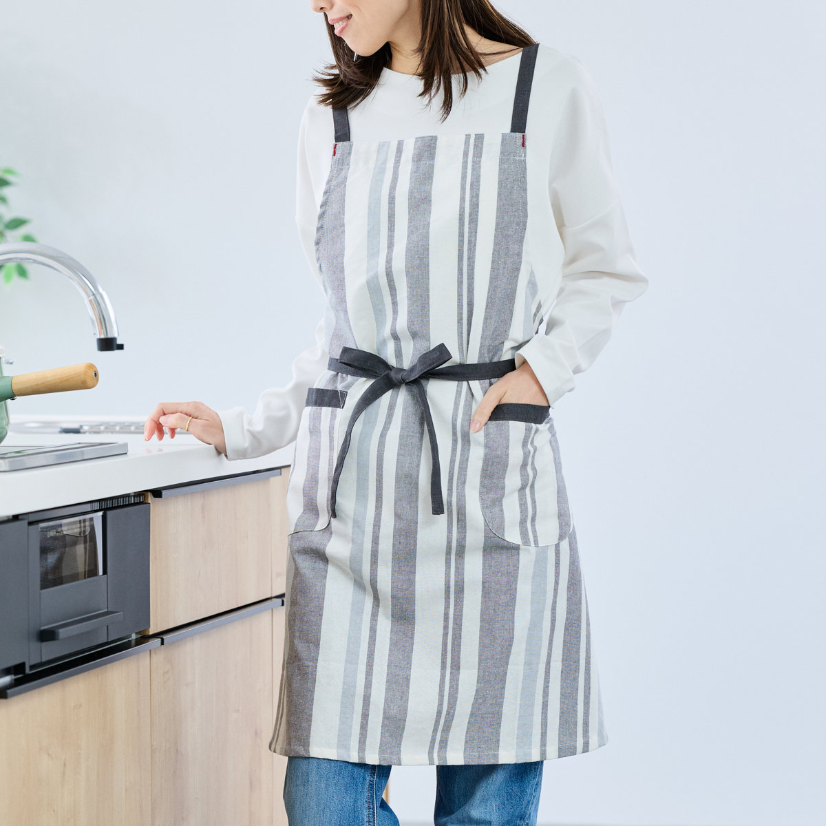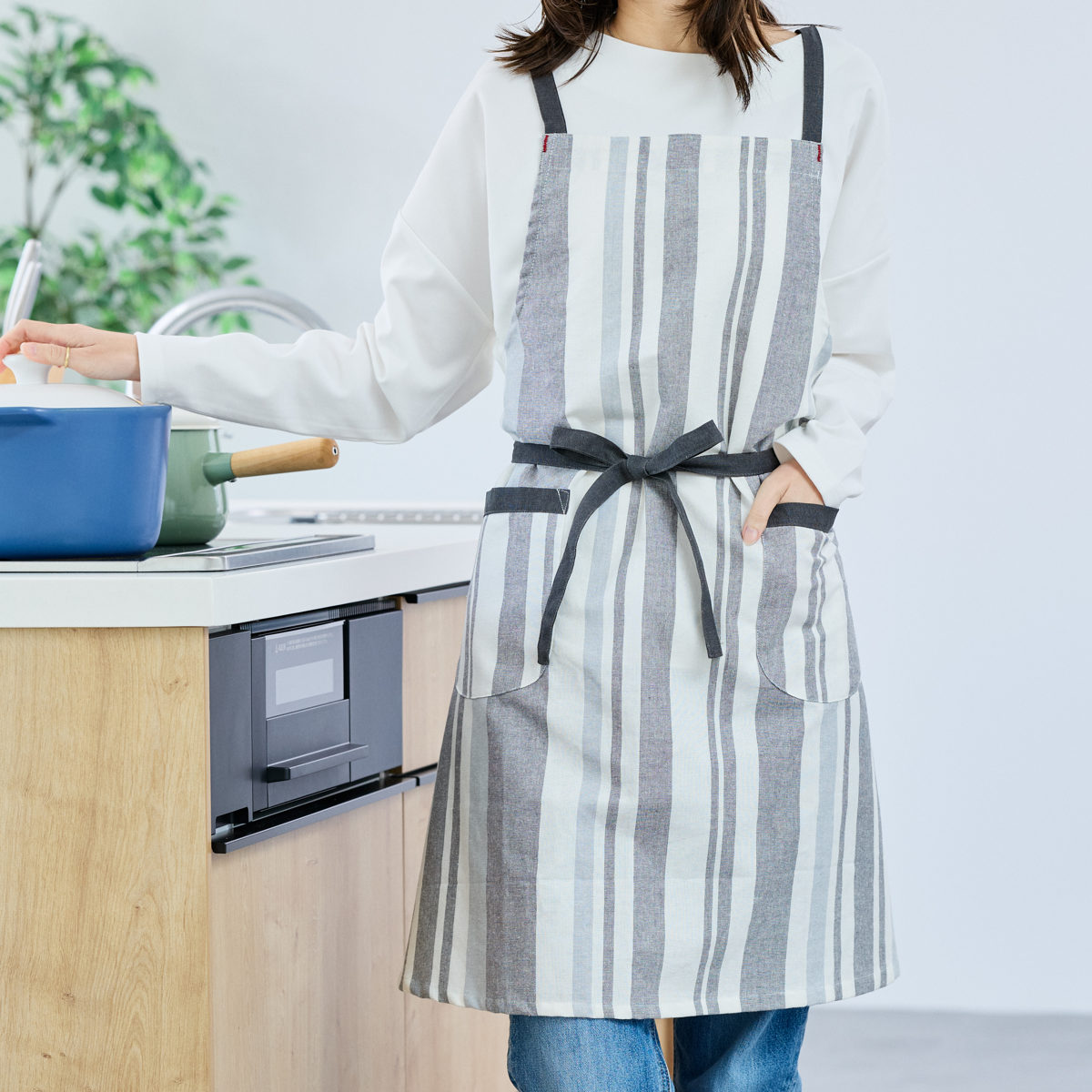 パターンやポケットの配置も見直し、見た目と使いやすさの両方にこだわった仕上がりです。両サイドにポケットがあり、スマホや小物を入れておくのにも便利です。縦のストライプ柄がすっきりとした印象を与え、どんなキッチンにもなじみやすいデザインです。