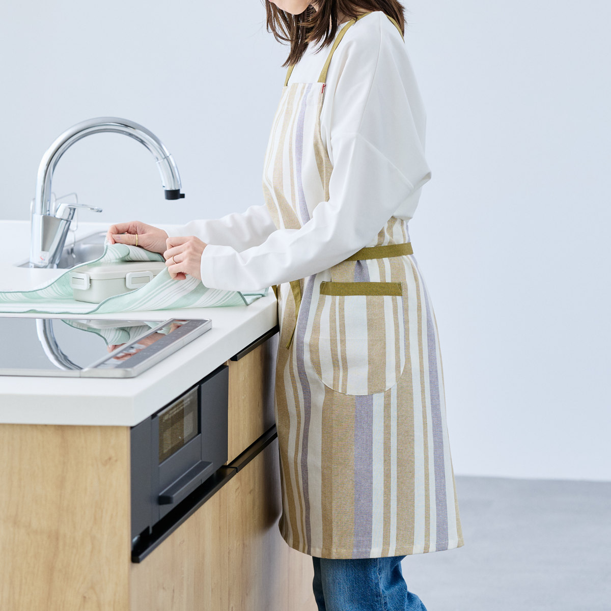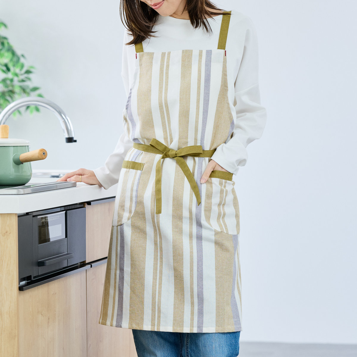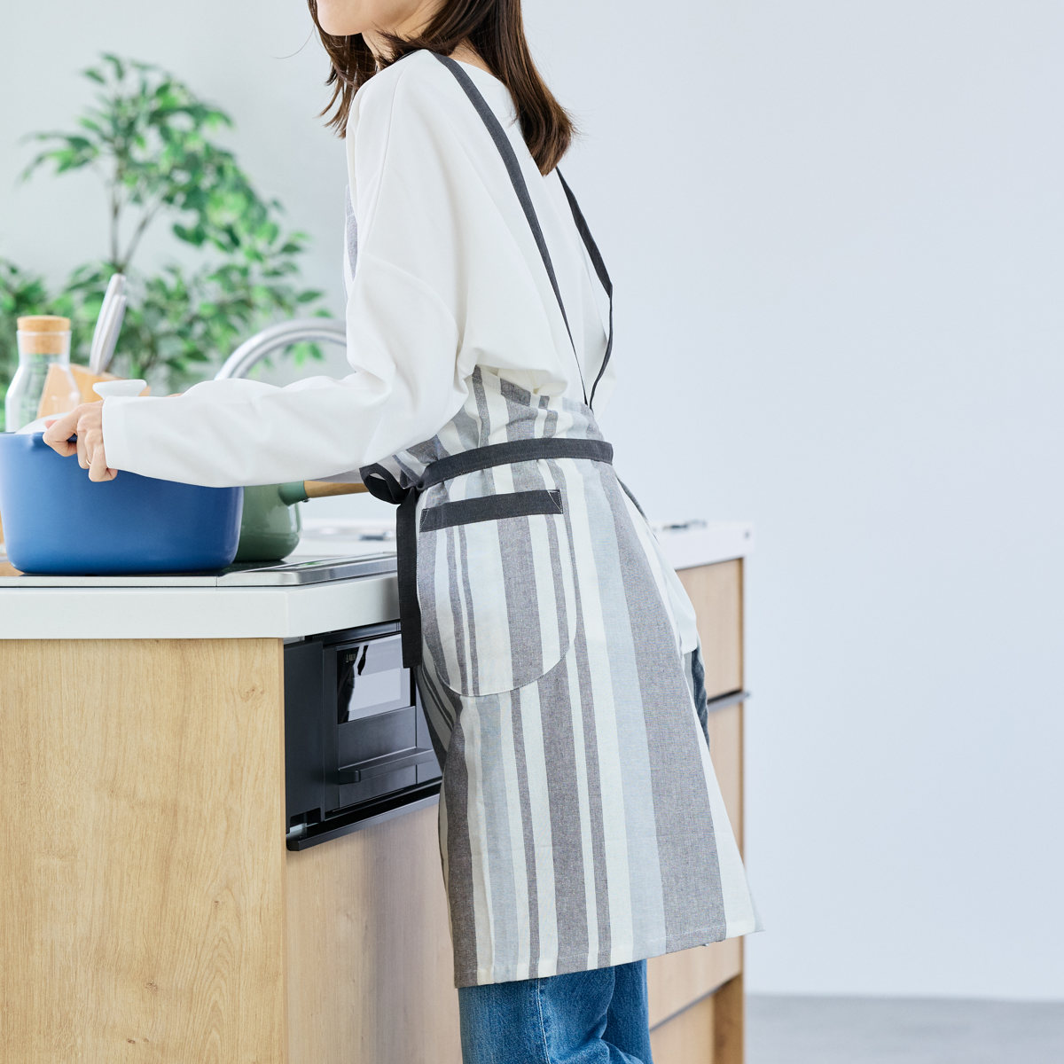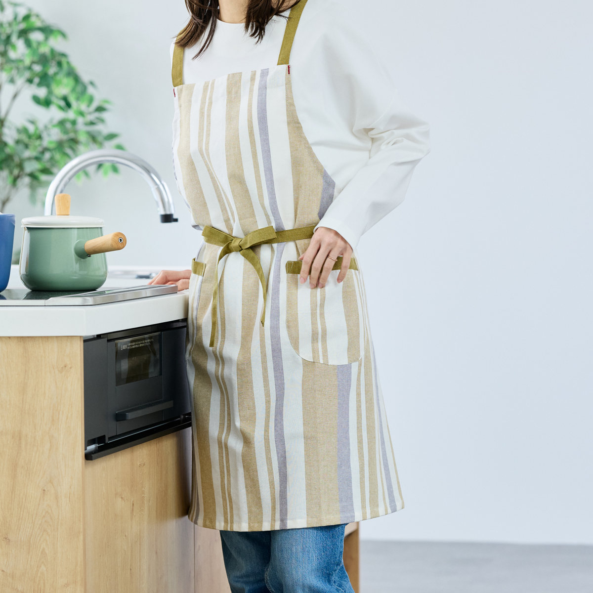 パターンやポケットの配置も見直し、見た目と使いやすさの両方にこだわった仕上がりです。両サイドにポケットがあり、スマホや小物を入れておくのにも便利です。縦のストライプ柄がすっきりとした印象を与え、どんなキッチンにもなじみやすいデザインです。
