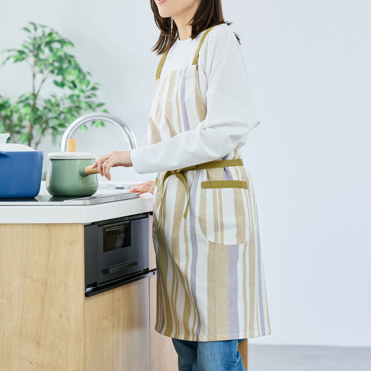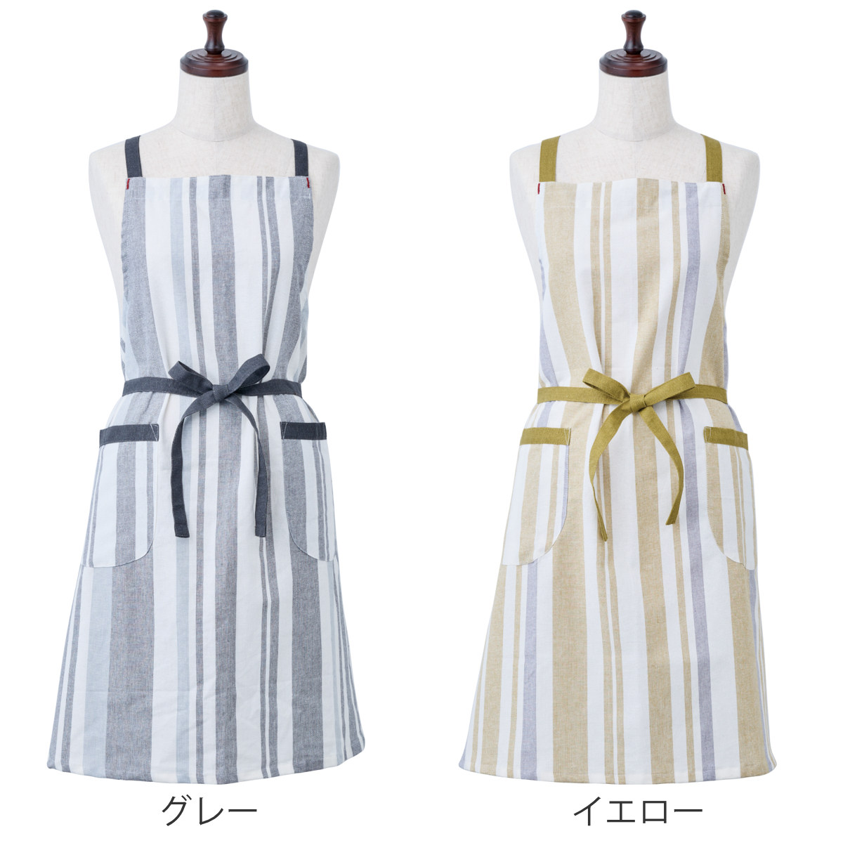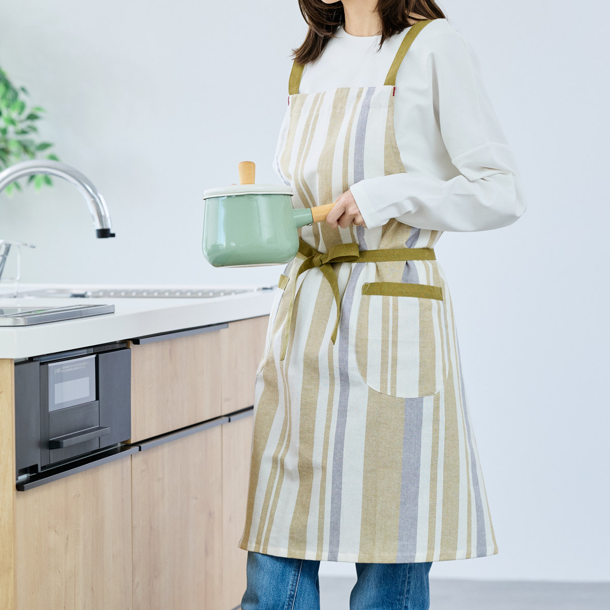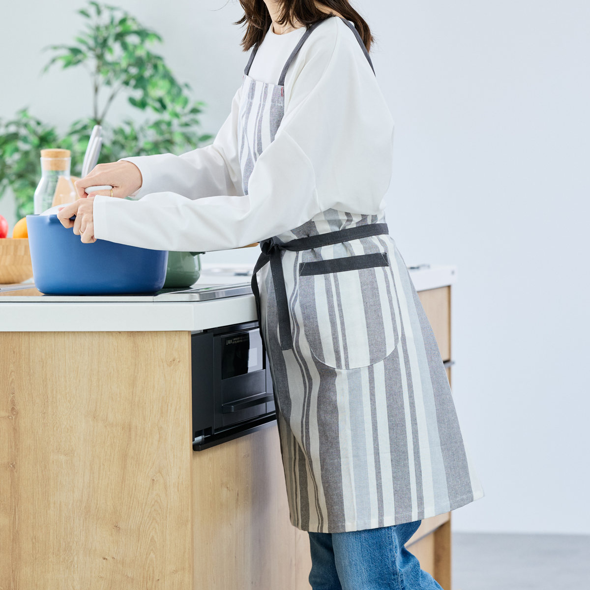 パターンやポケットの配置も見直し、見た目と使いやすさの両方にこだわった仕上がりです。両サイドにポケットがあり、スマホや小物を入れておくのにも便利です。縦のストライプ柄がすっきりとした印象を与え、どんなキッチンにもなじみやすいデザインです。
