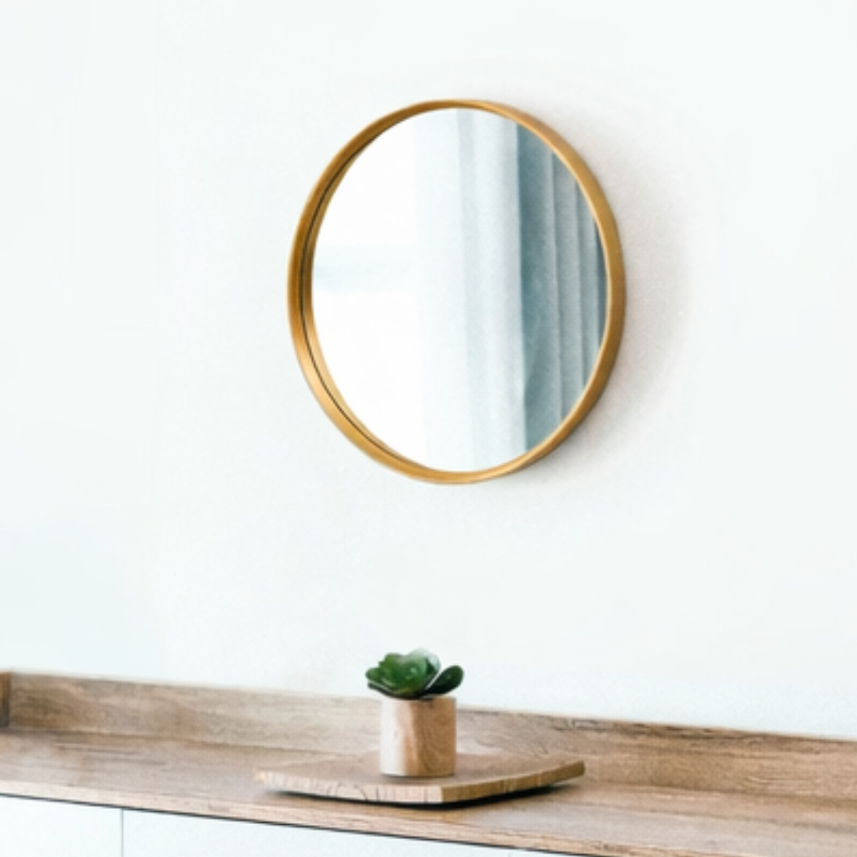 円形のフォルムが直線的になりがちな空間に柔らかさをプラスし、壁面をやさしく引き立てます。壁に掛けるだけで奥行きが生まれ、自然光や照明を反射して空間全体を明るく演出します。