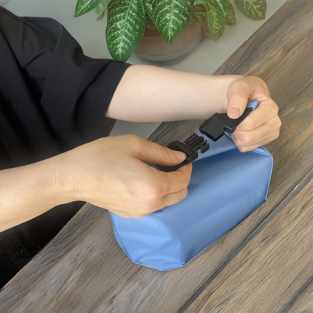 お弁当箱など中身の高さに合わせてくるっと丸めてからバックルを止めるだけで、簡単にサイズ調整ができます。