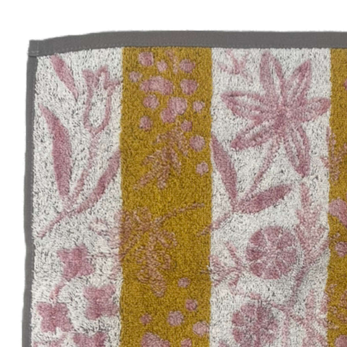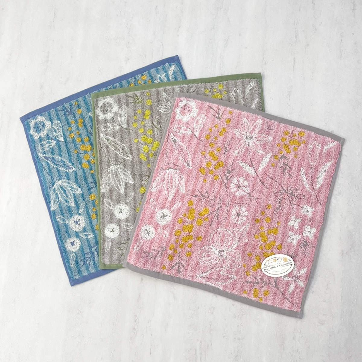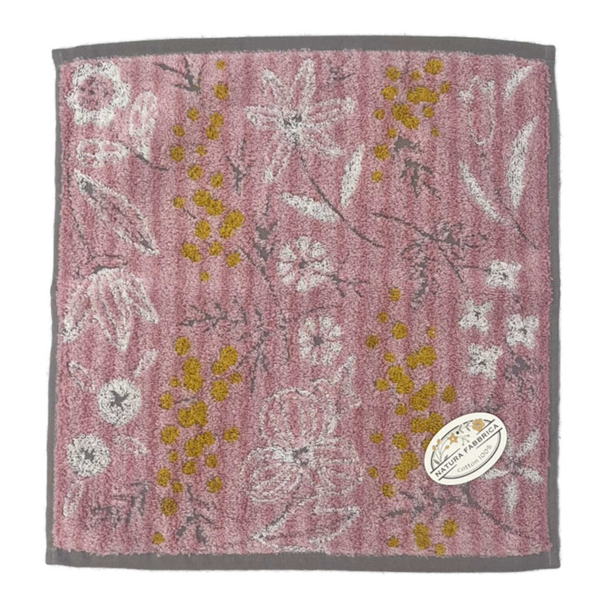 「ナチューラファブリカ ハピネス」シリーズのハンドタオルです。ふわりとやさしい風合いとナチュラルカラーは、毎日の生活に彩を与えてくれます。可愛らしい草花モチーフを全体にあしらった、やさしく上品なデザインです。自分用にはもちろんプレゼントにもおすすめです。