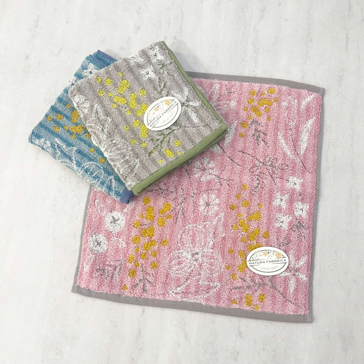 ふわりとやさしい風合いとナチュラルカラーで毎日の生活に彩りを与える「ナチューラファブリカ」シリーズです。ミニタオル、ハンドタオル、フェイスタオル、バスタオルの4サイズ展開で、お花や動物のデザインがあります。用途に合わせてお好みでお選びいただけます。