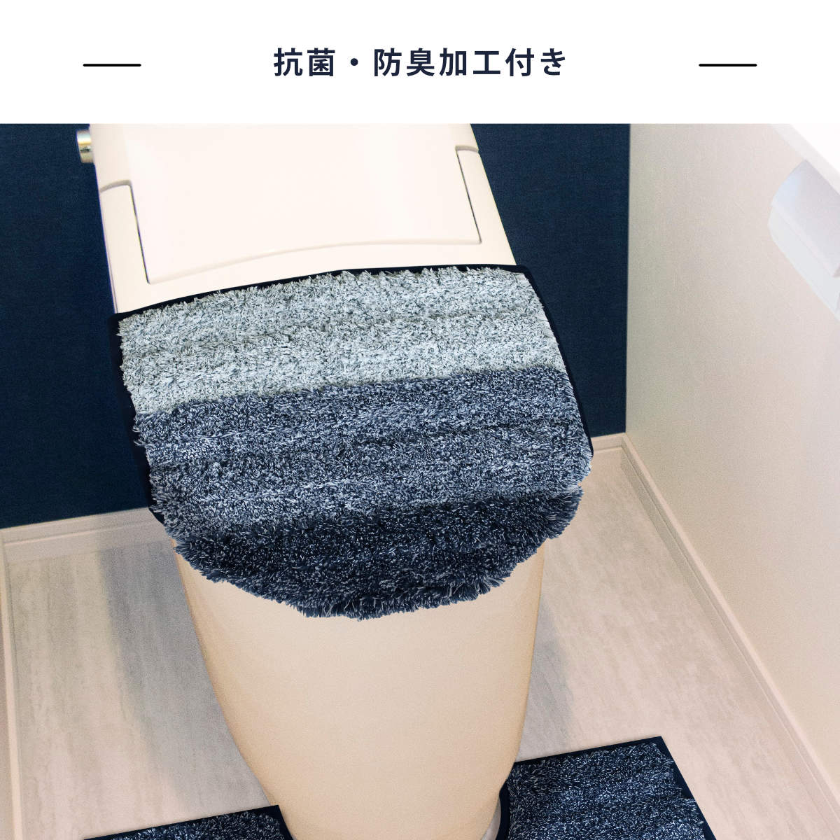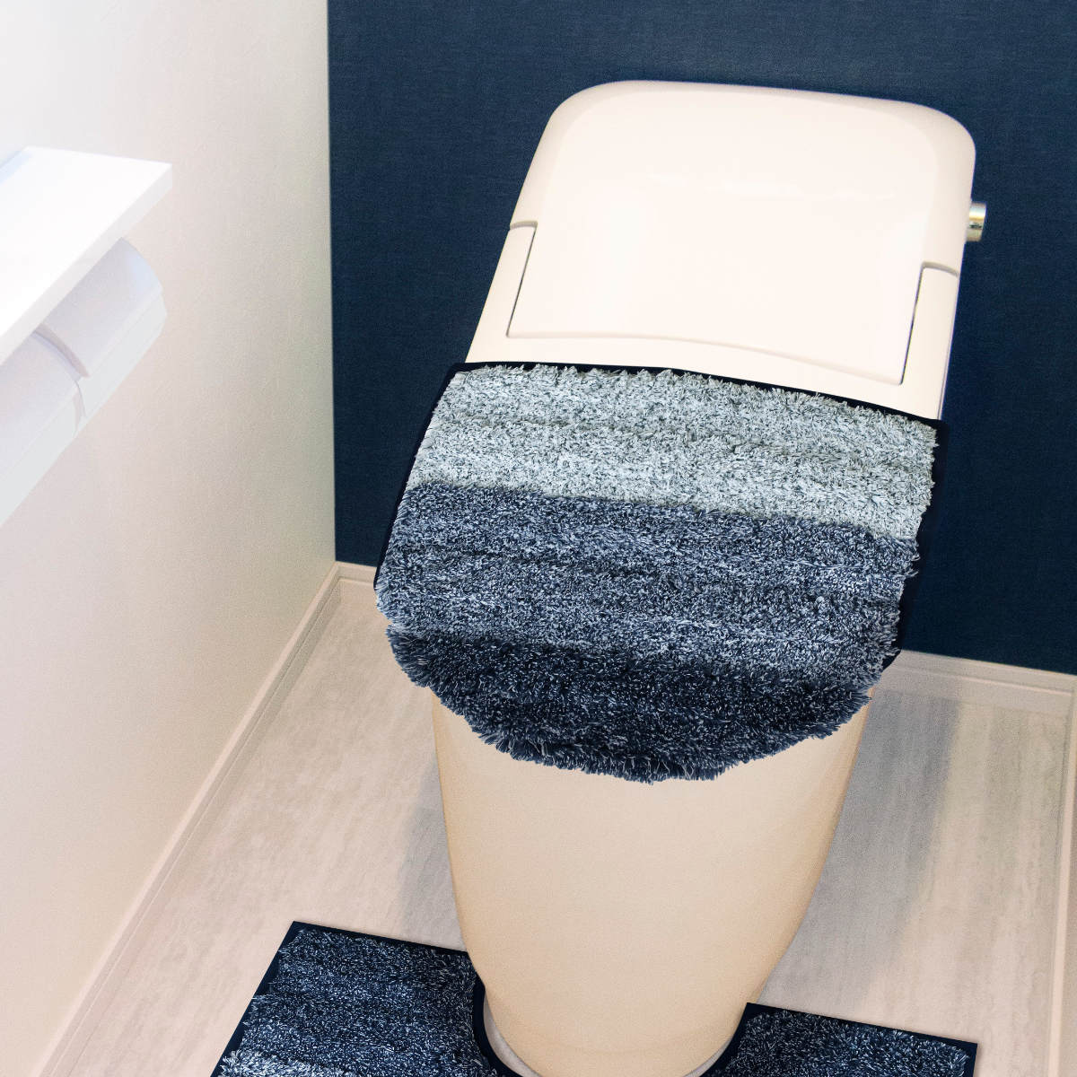 空間を引き締めるネイビーと、あたたかみのあるベージュの2色展開です。トイレマット・蓋カバーをご用意しています。シリーズで揃えて、統一感のあるトイレ空間づくりをお楽しみいただけます。