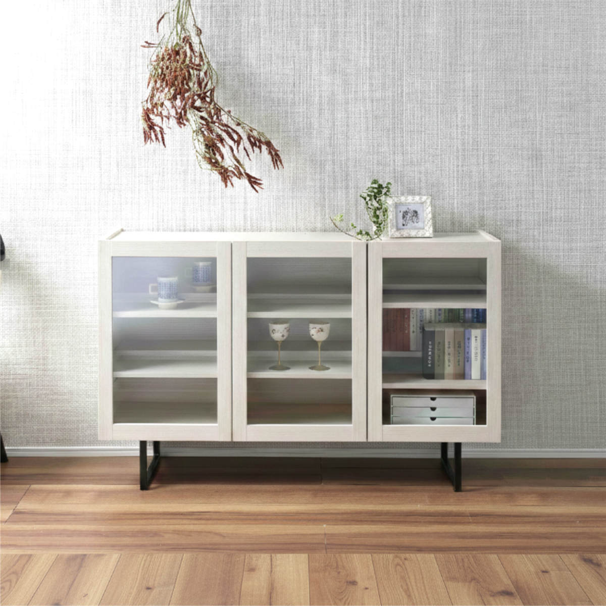 優れた収納力と使いやすさを兼ね備えたサイドボードです。収納したものがよく見えるガラス戸タイプで、お気に入りを飾る棚としても。奥行はわずか33.5cmのスリム設計で、お部屋を広く使うことができます。
