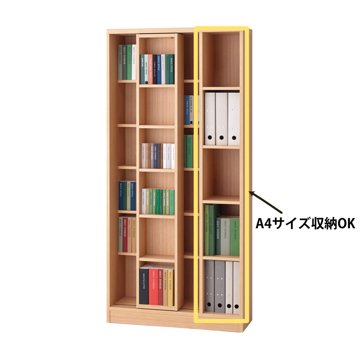 棚板の一部は可動棚です。収納したい本の高さに合わせて調節できるので、無駄がありません。A4サイズの書類やファイルは、右側の5段に収納可能です。