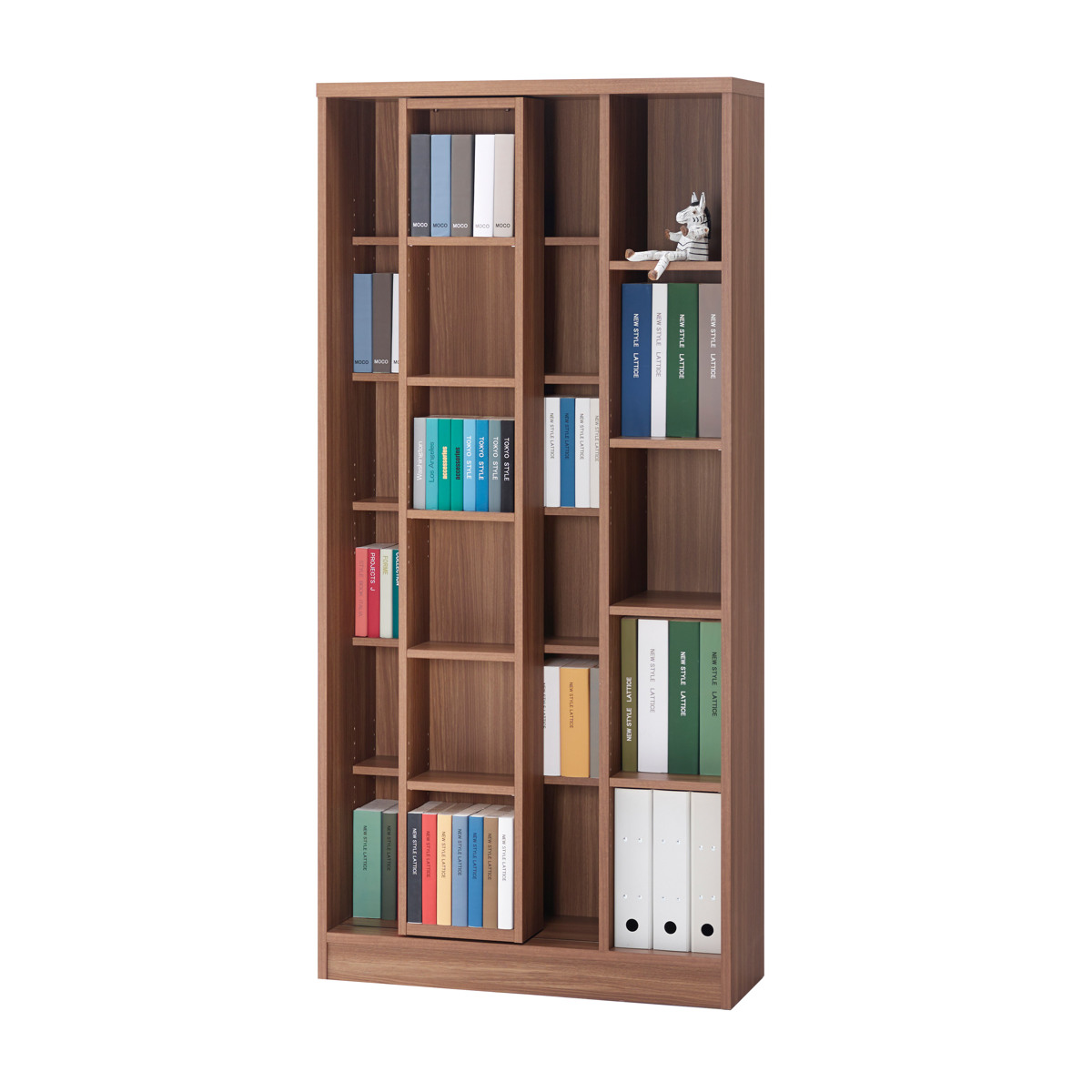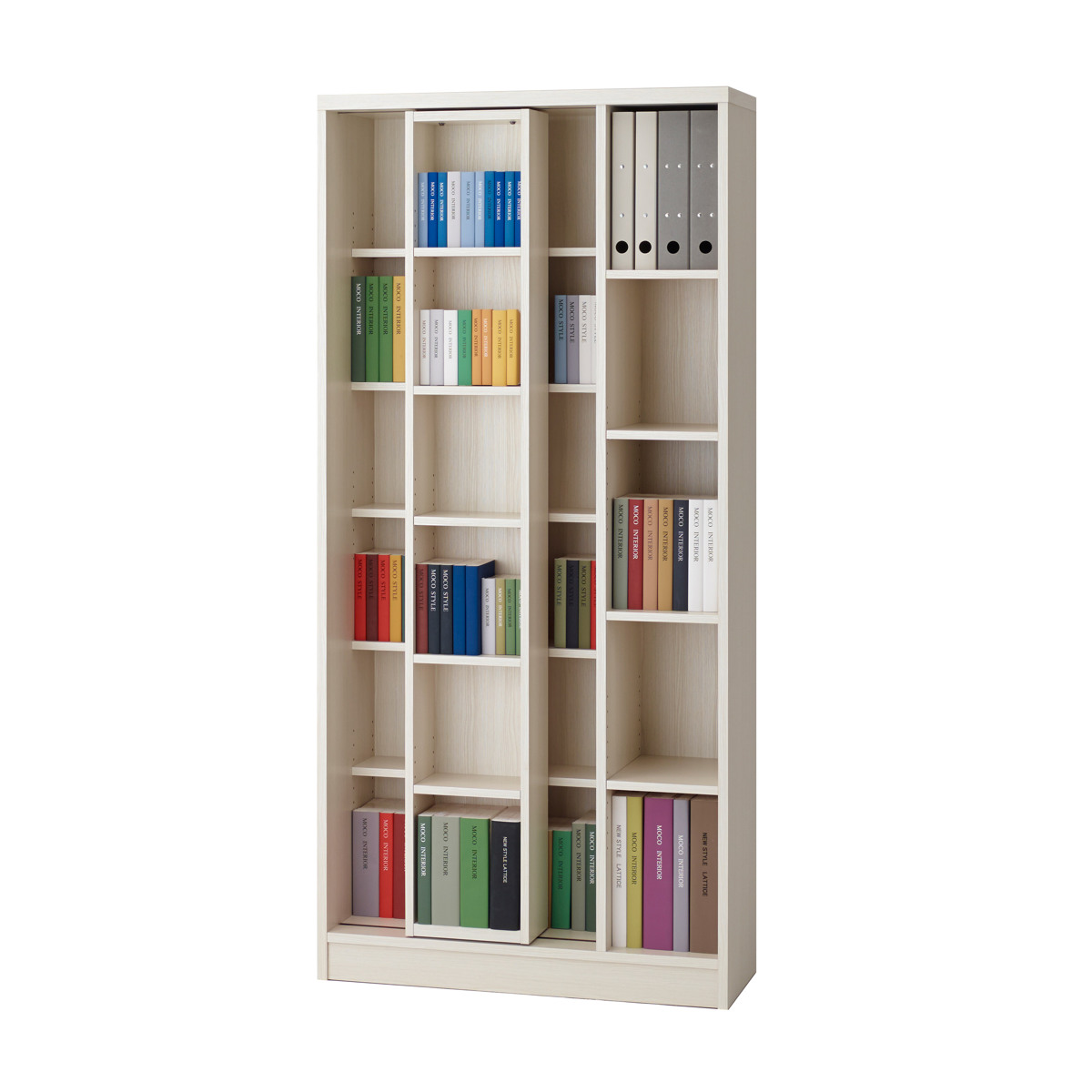 A4やB5はもちろん、単行本・新書・コミックなど、様々なサイズの本に対応した本棚です。前部はスライド式で、後部に収納したものの出し入れがしやすい仕様です。空間に馴染みやすいベーシックな3色からお選びいただけます。