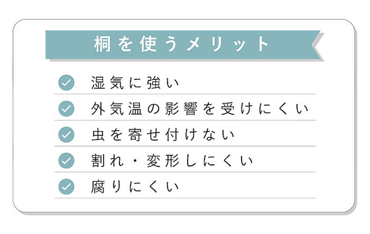 桐材は通気性が良く、湿気が含まれると気密性が高くなるので、衣類をカビや害虫から守ることができます。また、桐材にはタンニンという防腐能力が高い成分が多く含まれているため、腐食に強いのも魅力です。防虫効果があるので、ニットなどの衣類の収納に最適です。