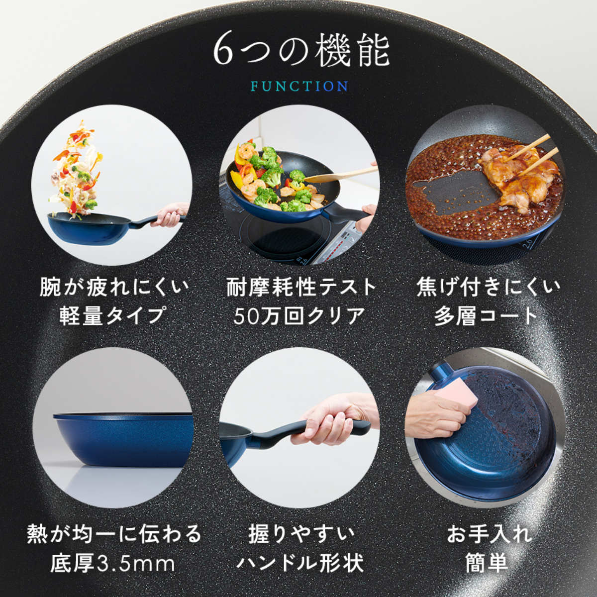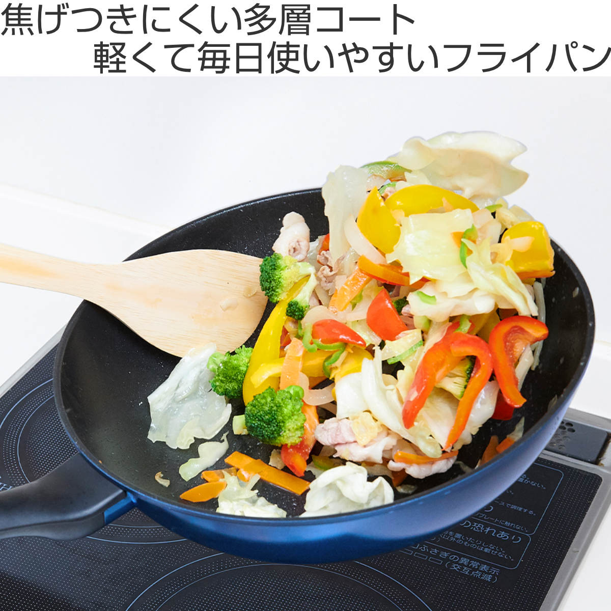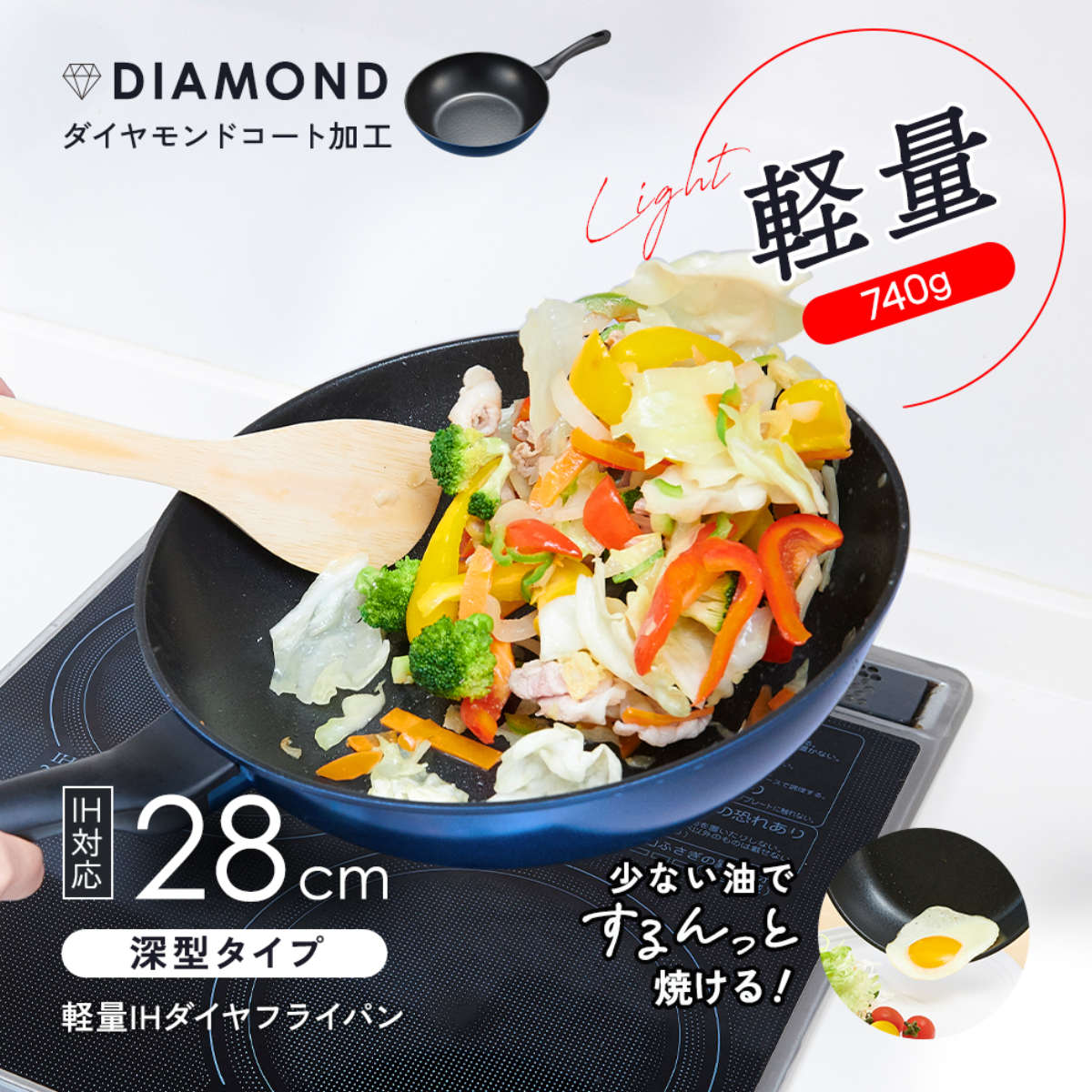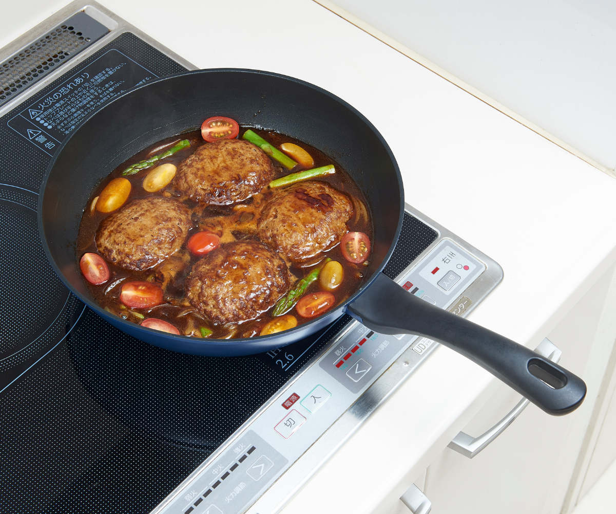 人工ダイヤモンド配合ふっ素コートとアルミニウム合金の内面2層・外面2層の多層コートのフライパンです。焦げ付きにくく、少ない油でヘルシーに調理できます。耐摩耗テスト50万回をクリアした、優れた耐久性を備えています。