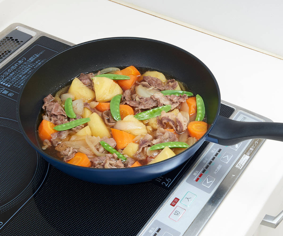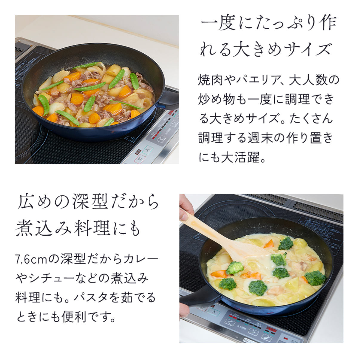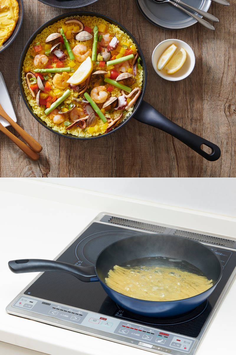 焼肉やパエリア、大人数の炒め物も一度に調理できる大きめサイズです。作り置きの調理にも活躍します。広めの深型なので、カレーやシチューなど煮込み料理やパスタを茹でるときにも便利です。