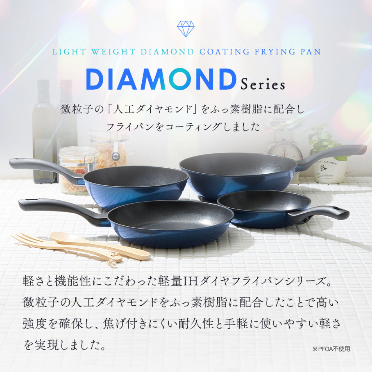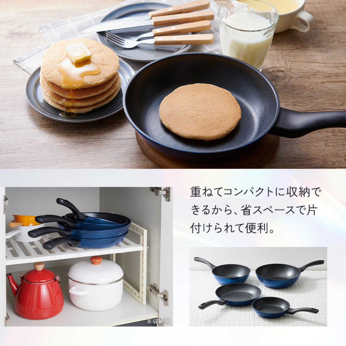 軽さと機能性にこだわったダイヤフライパンシリーズです。サイズ違いを重ねてコンパクトに収納できます。