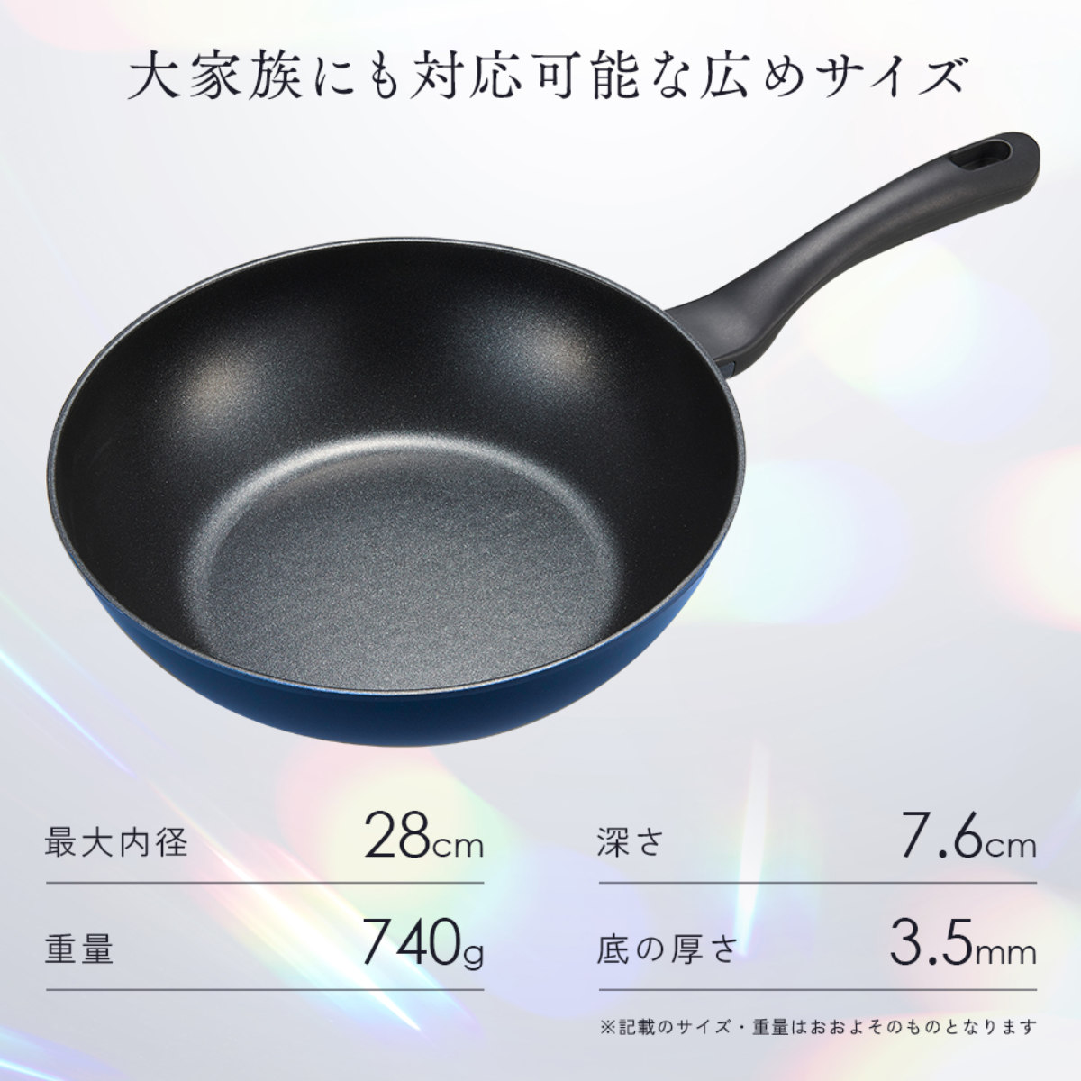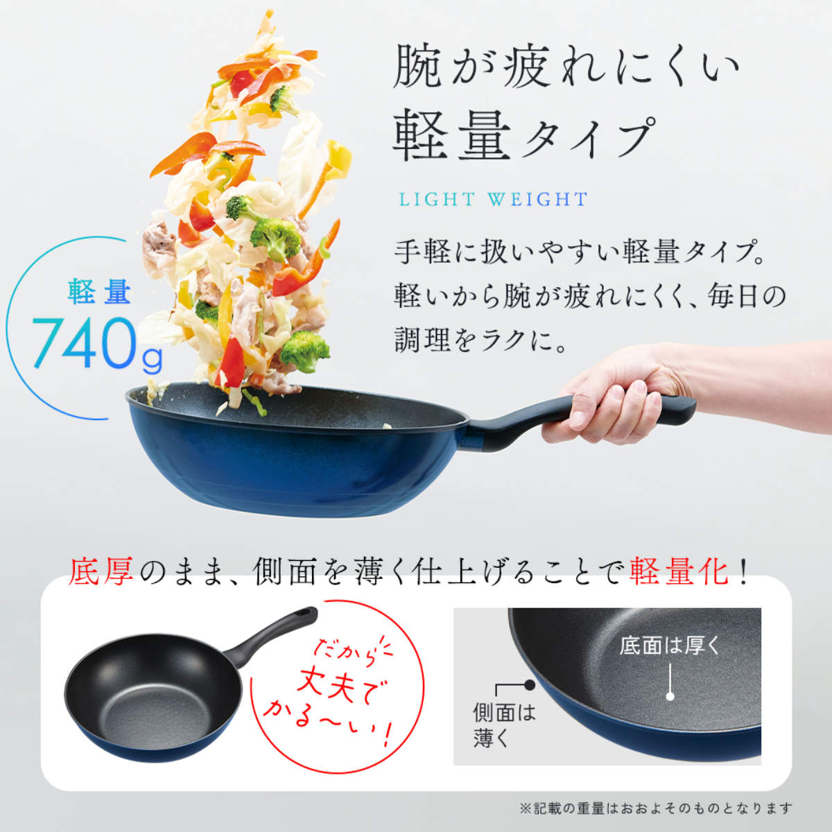 軽量設計で扱いやすく、毎日の調理でも腕が疲れにくいです。焦げつきにくい耐久性と、手軽に使える軽さを両立しました。