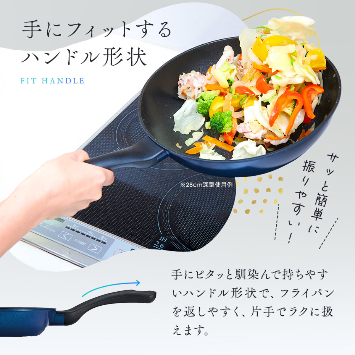手に馴染んで持ちやすいハンドル形状で、フライパンを返しやすく片手で楽に扱えます。
