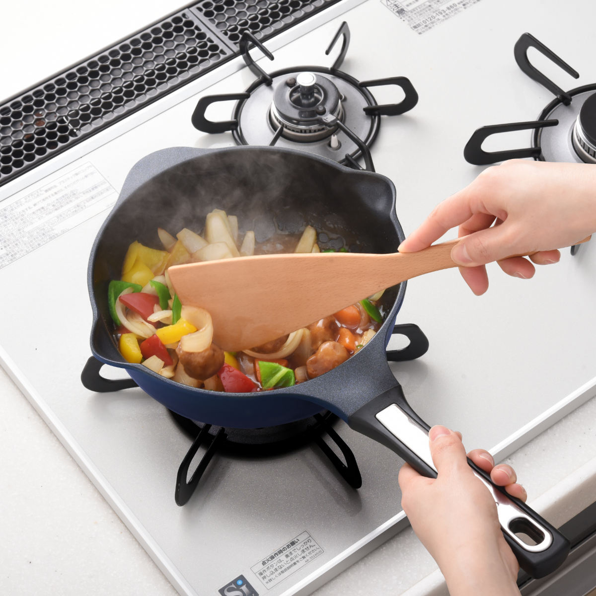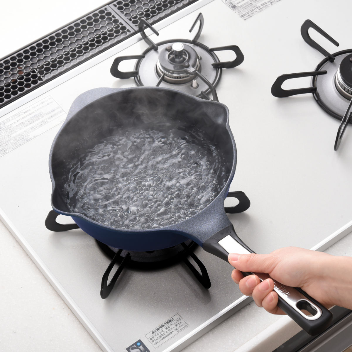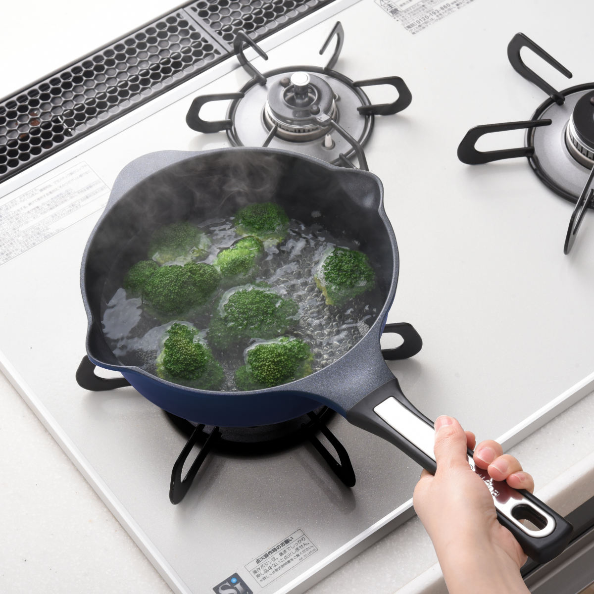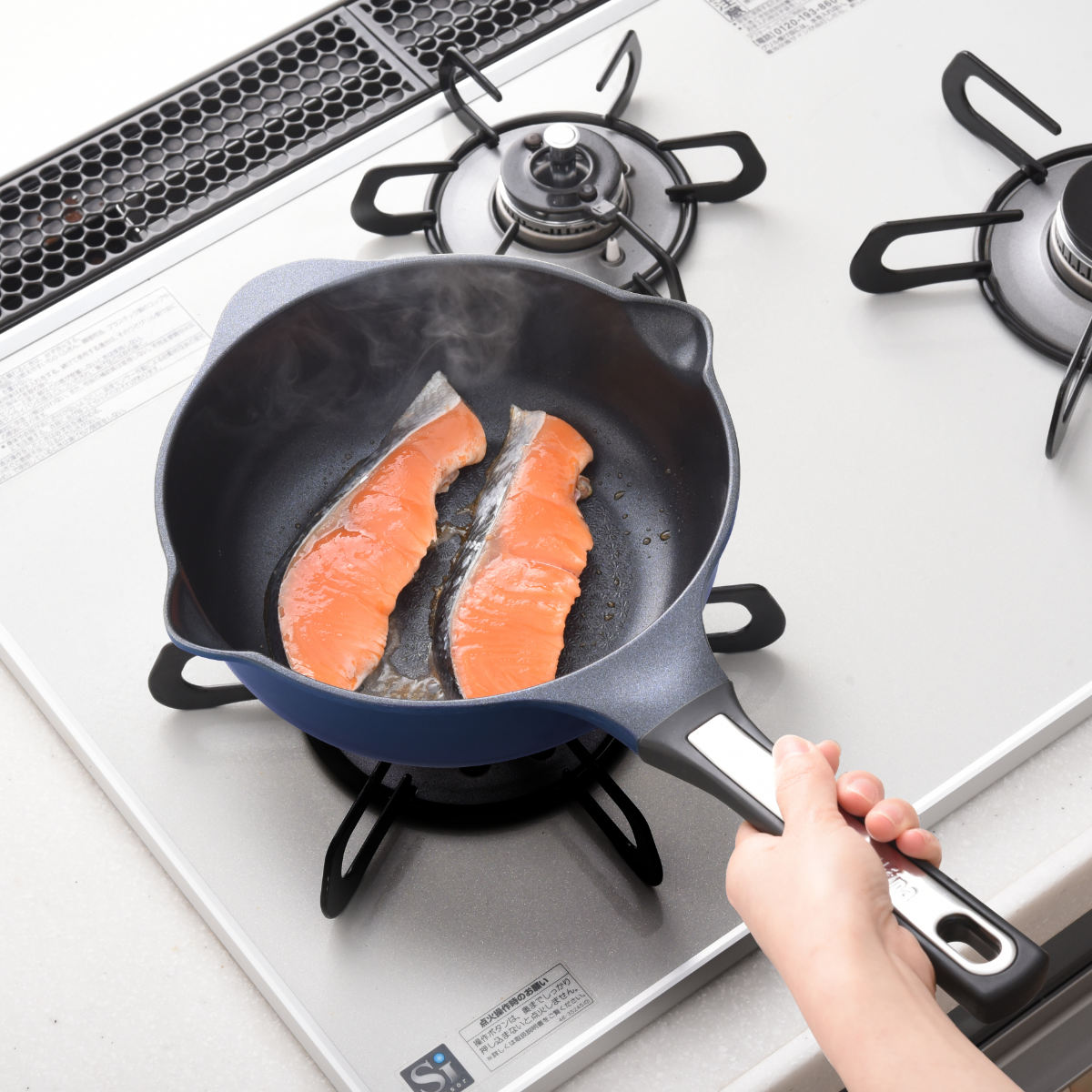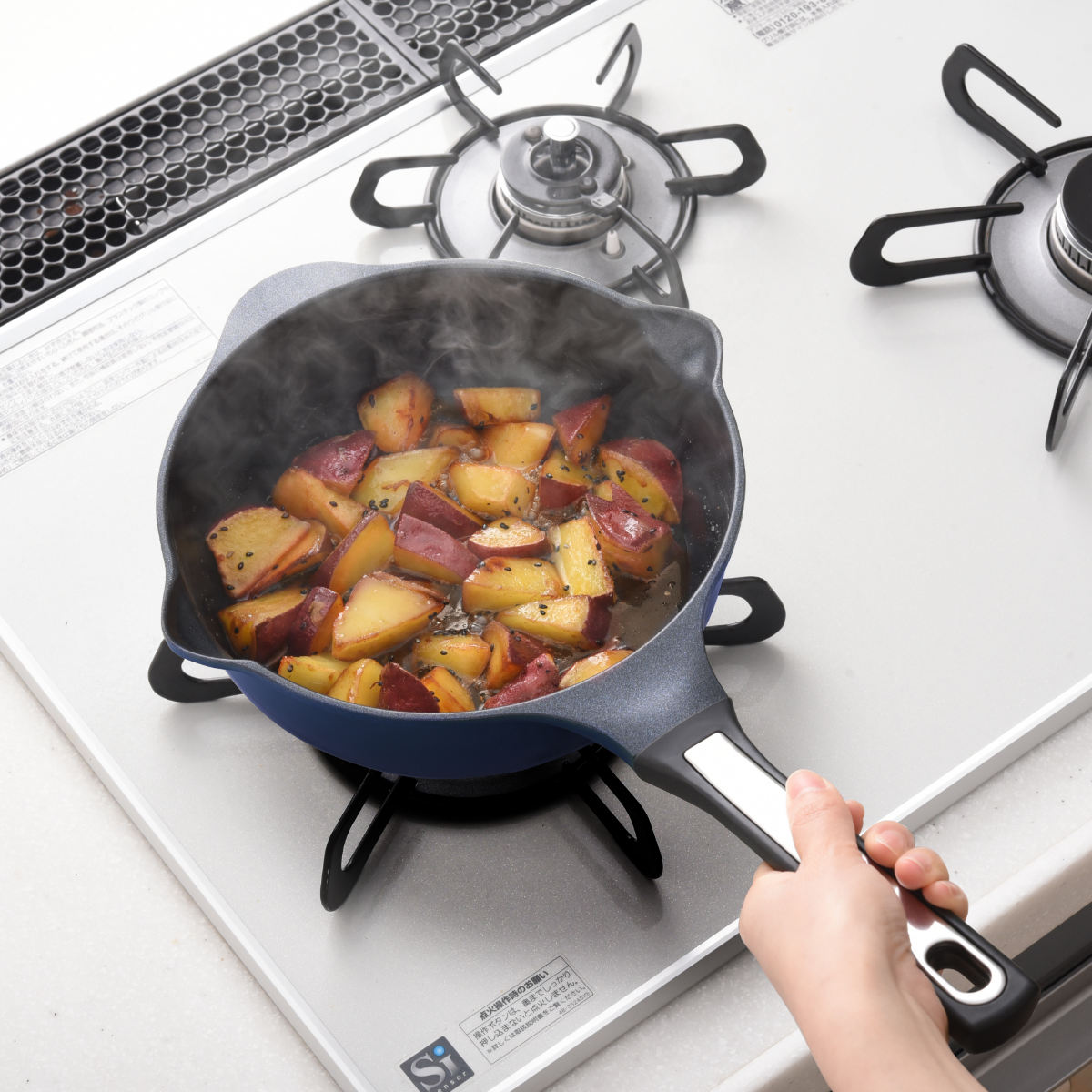 「焼く」「煮る」「炒める」「揚げる」「茹でる」「沸かす」の6役をこなすフライパンです。底面はしっかりと肉厚を持たせて熱を均一に伝えつつ、側面の余分な厚みを抑えることで、軽さと使いやすさを両立しています。