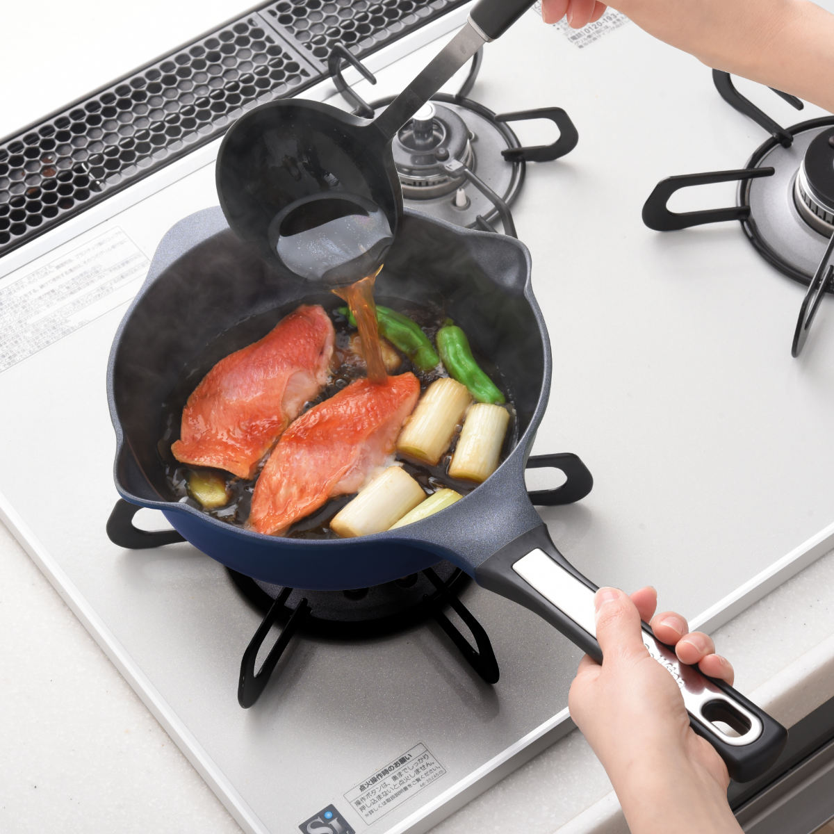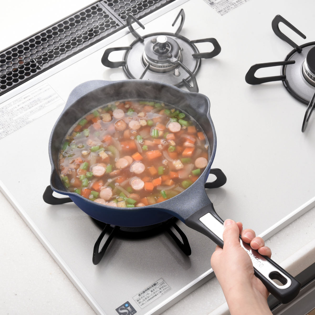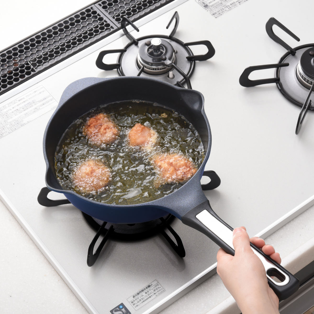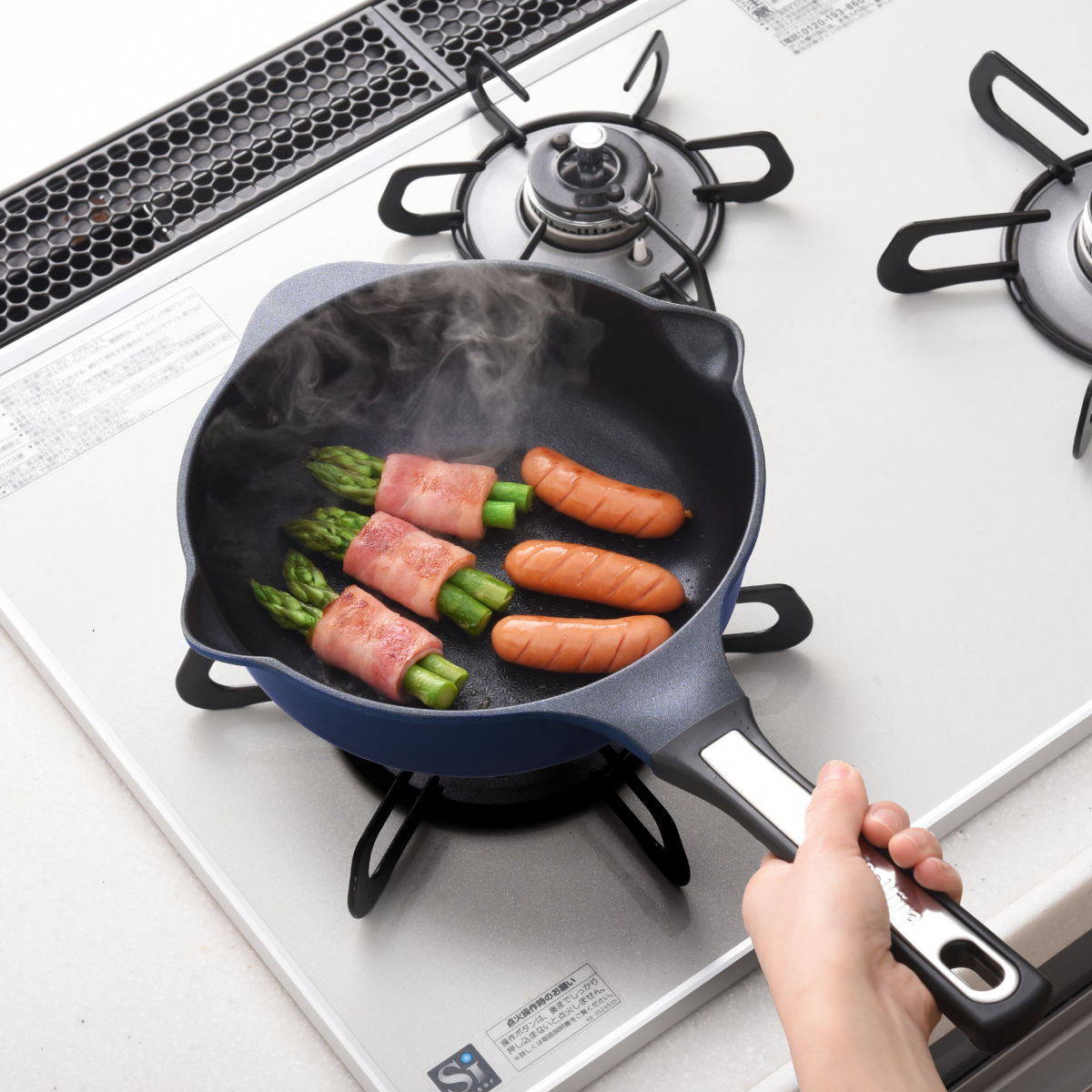 「焼く」「煮る」「炒める」「揚げる」「茹でる」「沸かす」の6役をこなすフライパンです。底面はしっかりと肉厚を持たせて熱を均一に伝えつつ、側面の余分な厚みを抑えることで、軽さと使いやすさを両立しています。