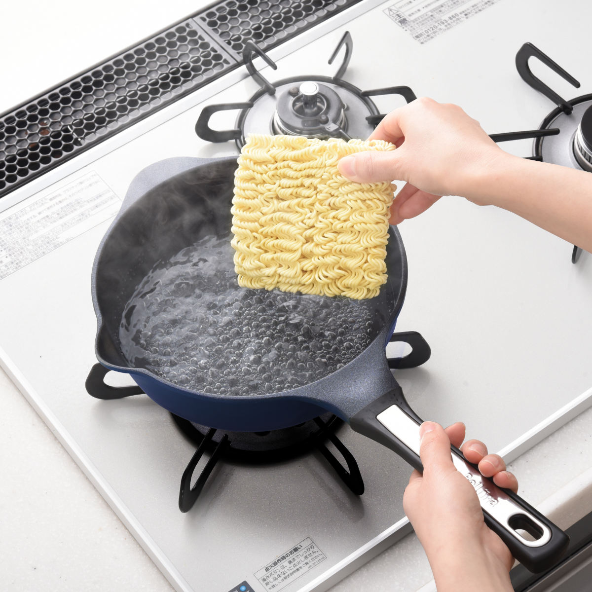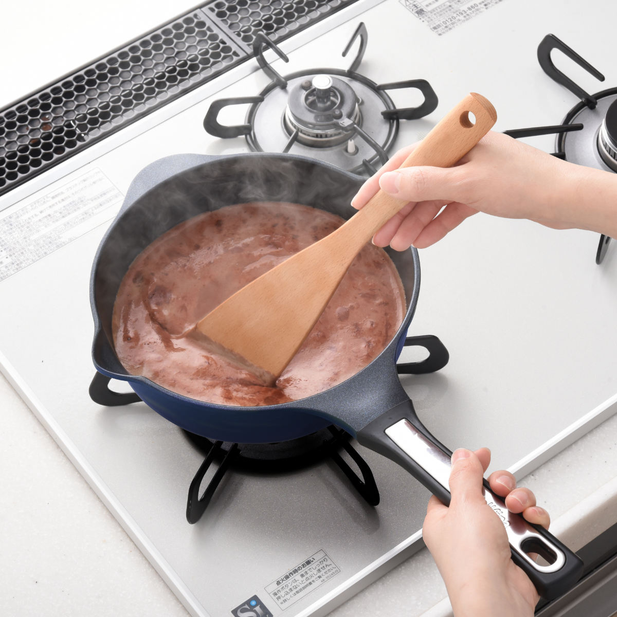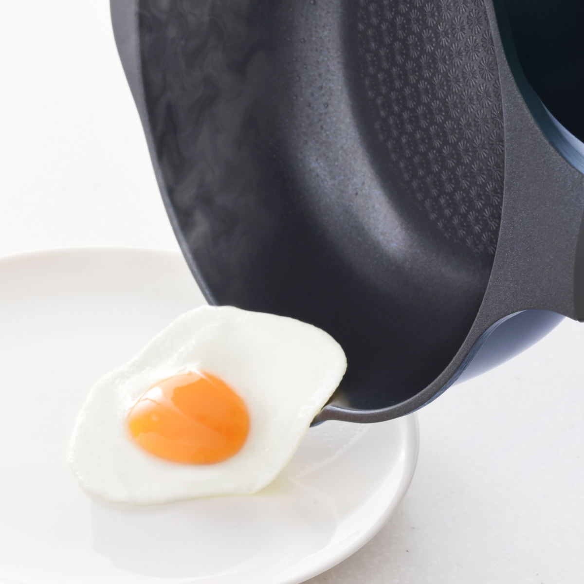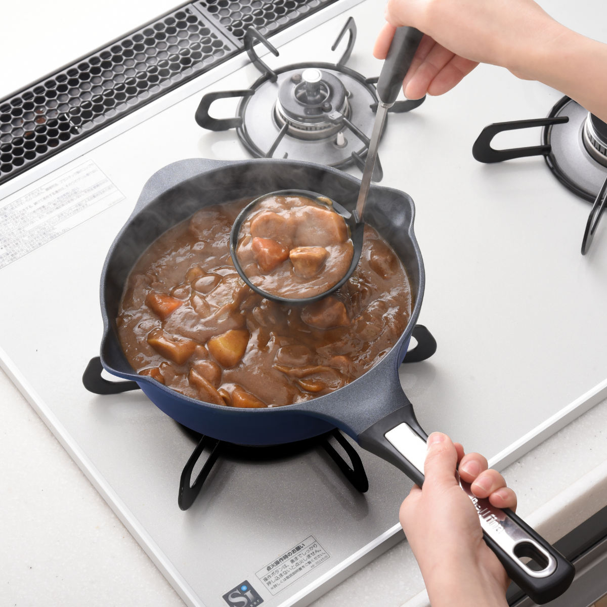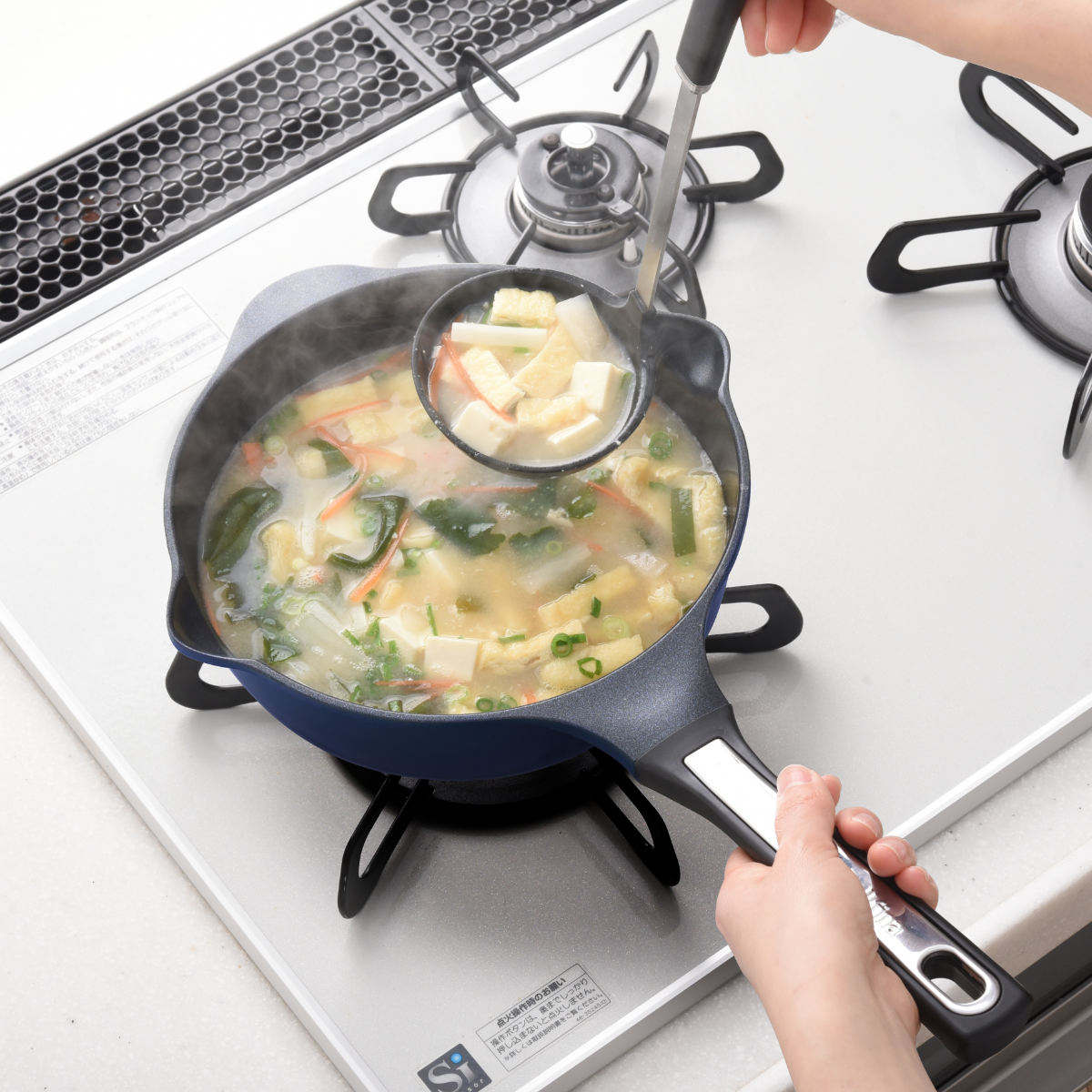 「焼く」「煮る」「炒める」「揚げる」「茹でる」「沸かす」の6役をこなすフライパンです。底面はしっかりと肉厚を持たせて熱を均一に伝えつつ、側面の余分な厚みを抑えることで、軽さと使いやすさを両立しています。