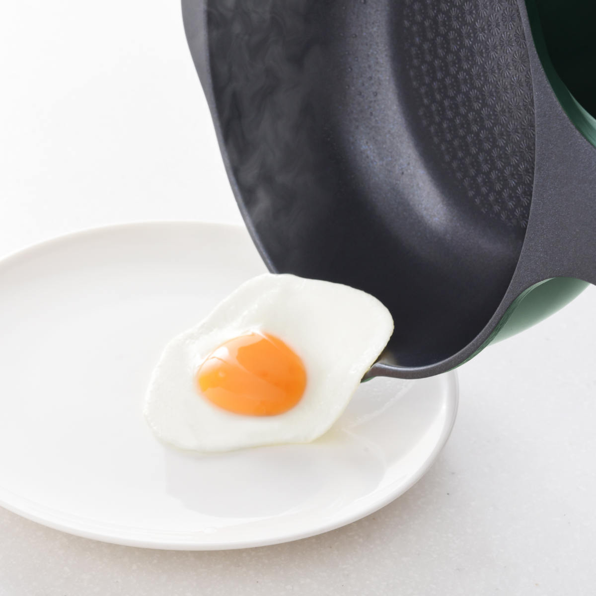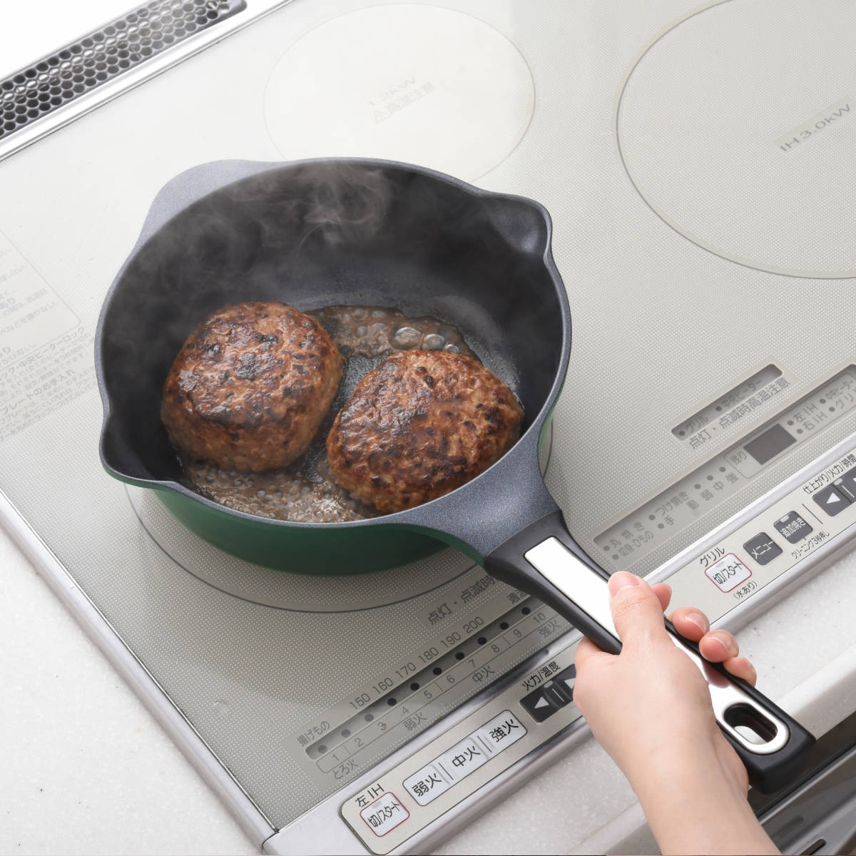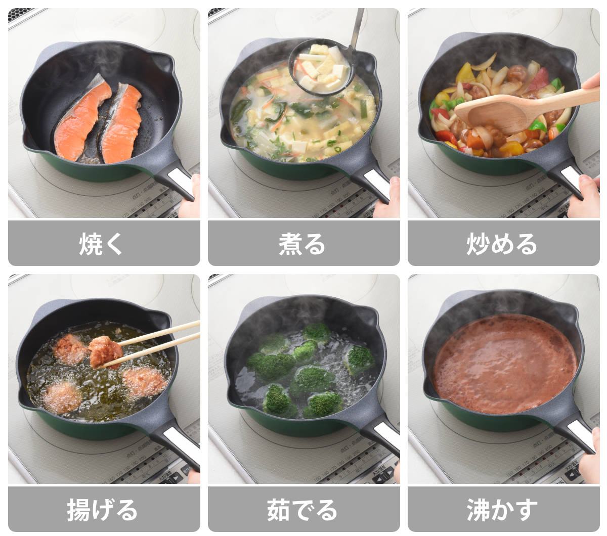 「焼く」「煮る」「炒める」「揚げる」「茹でる」「沸かす」の6役をこなすフライパンです。底面はしっかりと肉厚を持たせて熱を均一に伝えつつ、側面の余分な厚みを抑えることで、軽さと使いやすさを両立しています。