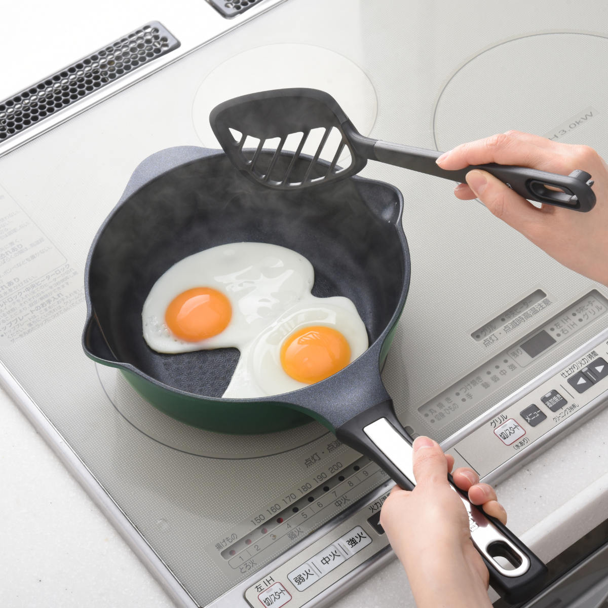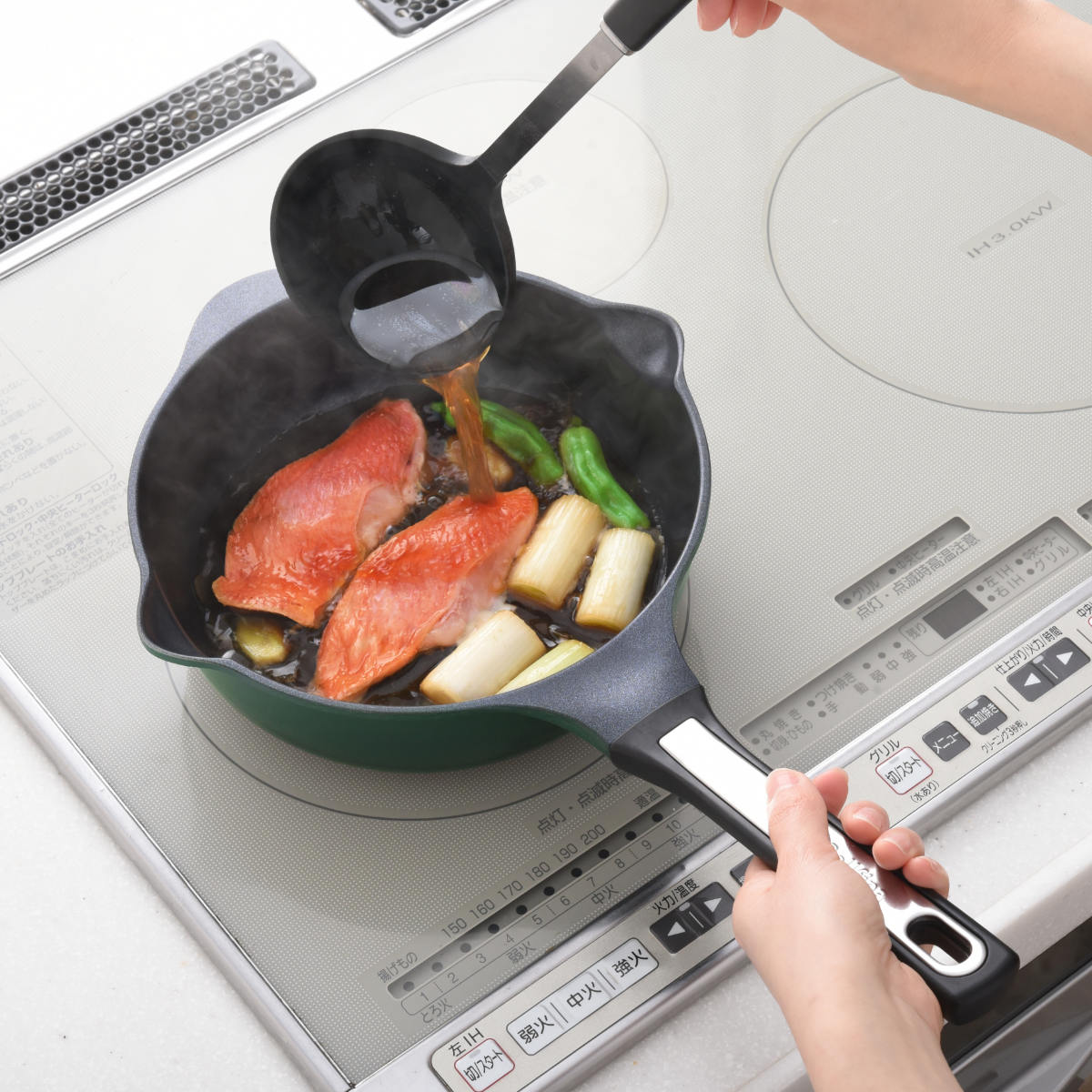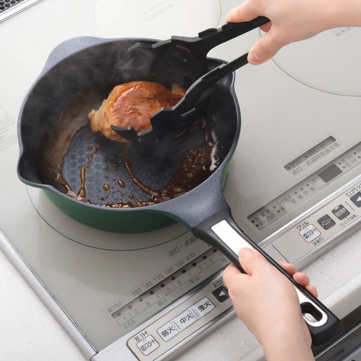 「焼く」「煮る」「炒める」「揚げる」「茹でる」「沸かす」の6役をこなすフライパンです。底面はしっかりと肉厚を持たせて熱を均一に伝えつつ、側面の余分な厚みを抑えることで、軽さと使いやすさを両立しています。