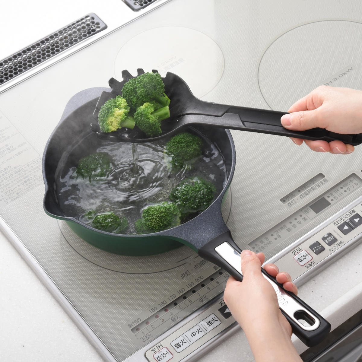 ハンドルの反対側に補助取っ手付きです。茹で汁を流す際に両手でしっかり持てて便利です。