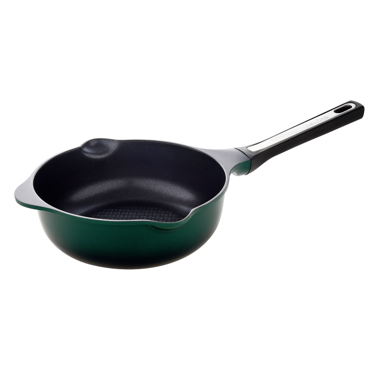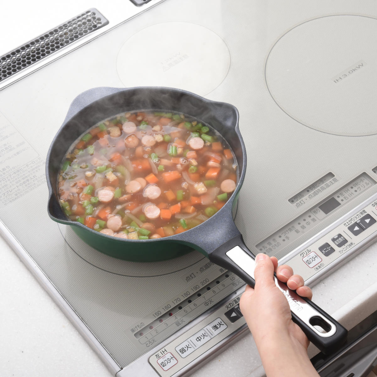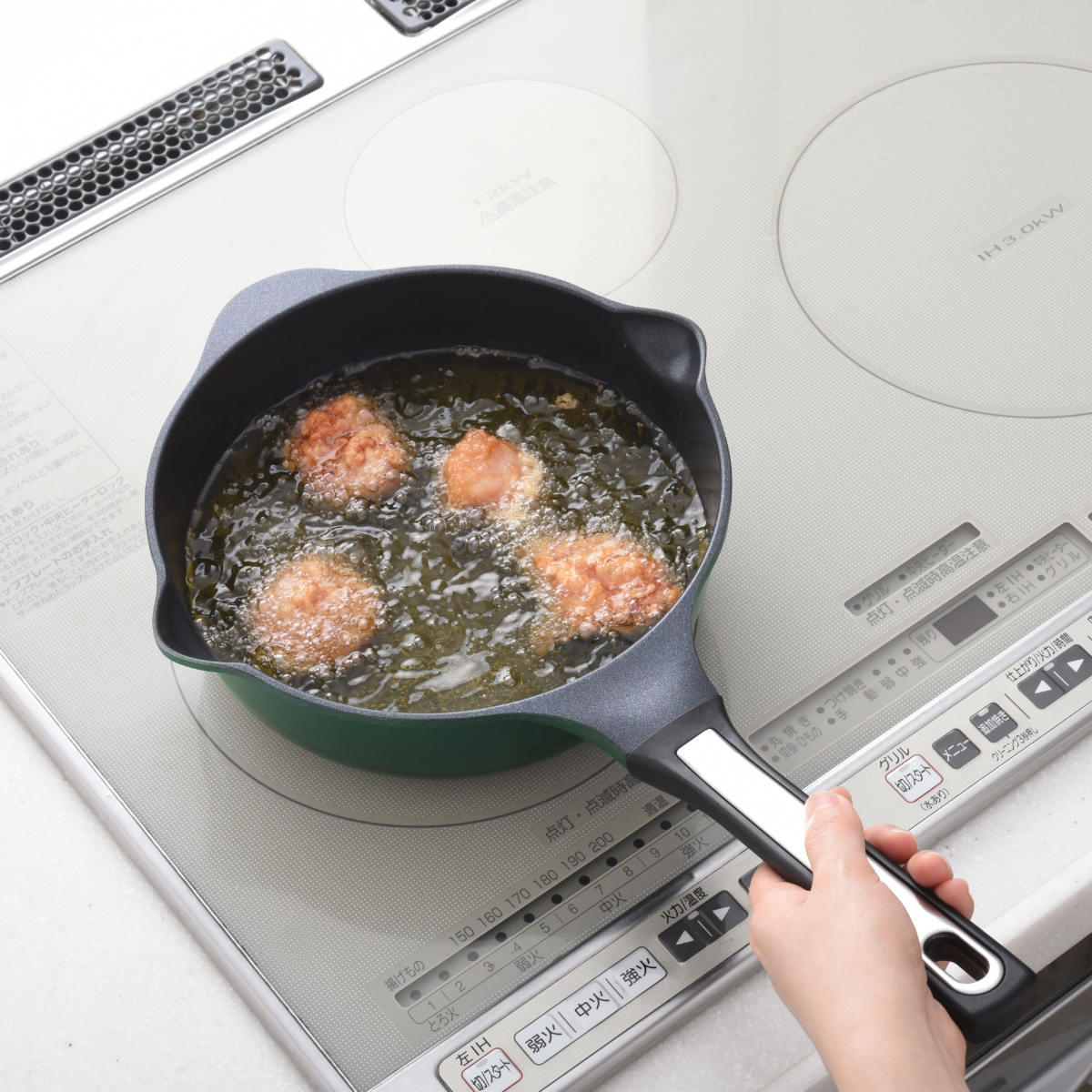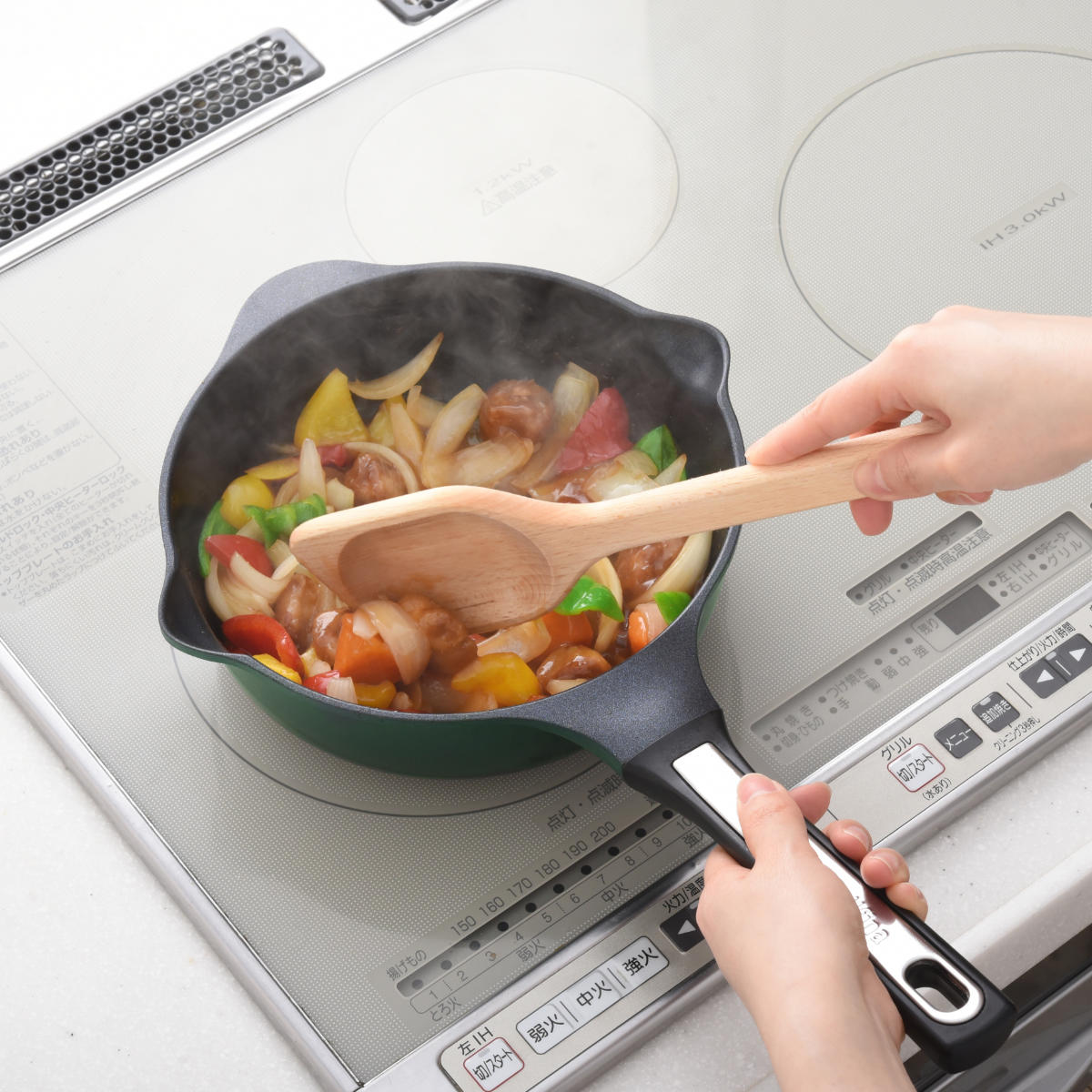 | 材質 | 本体:アルミニウム合金(内面/ふっ素樹脂塗膜加工、外面/焼付塗装) 外底面:鉄(溶射加工) ハンドル:フェノール樹脂 |