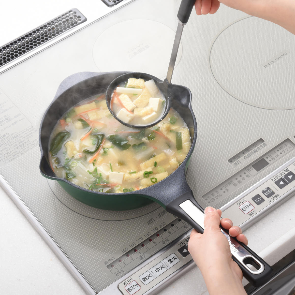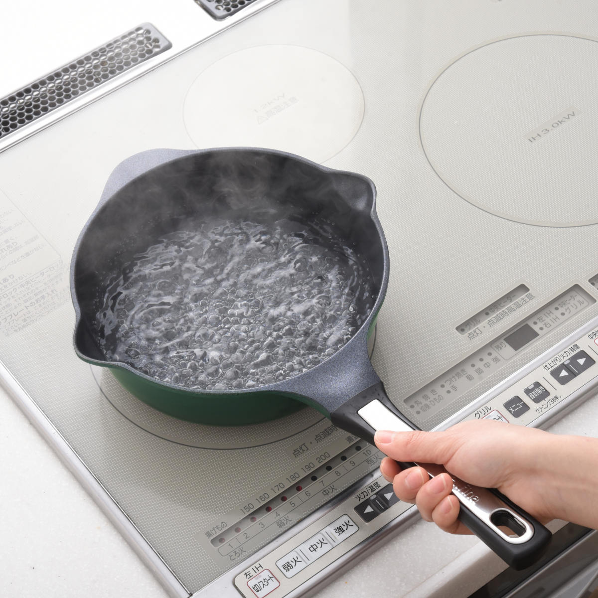 キレの良さにこだわった注ぎ口で、側面に垂れがちな汁物や粘度のあるソースも注ぎやすいです。やかん要らずでキッチンがすっきりします。