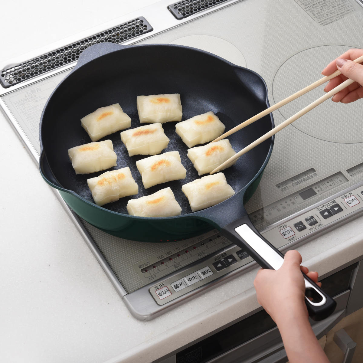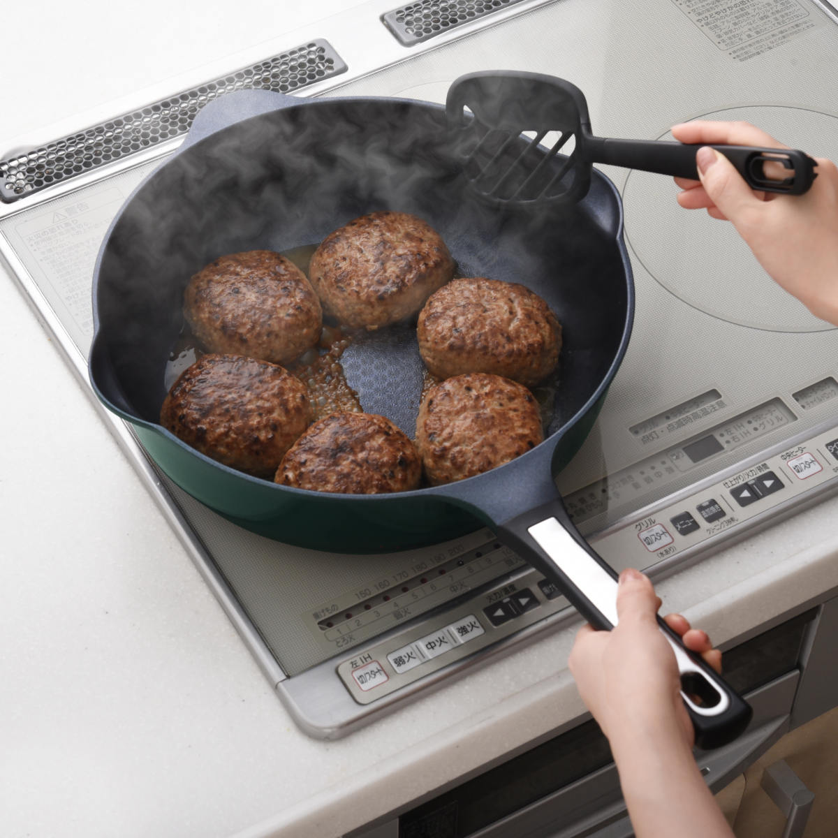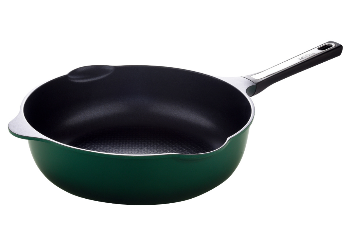 「焼く」「煮る」「炒める」「揚げる」「茹でる」「沸かす」の6役をこなすフライパンです。底面はしっかりと肉厚を持たせて熱を均一に伝えつつ、側面の余分な厚みを抑えることで、軽さと使いやすさを両立しています。