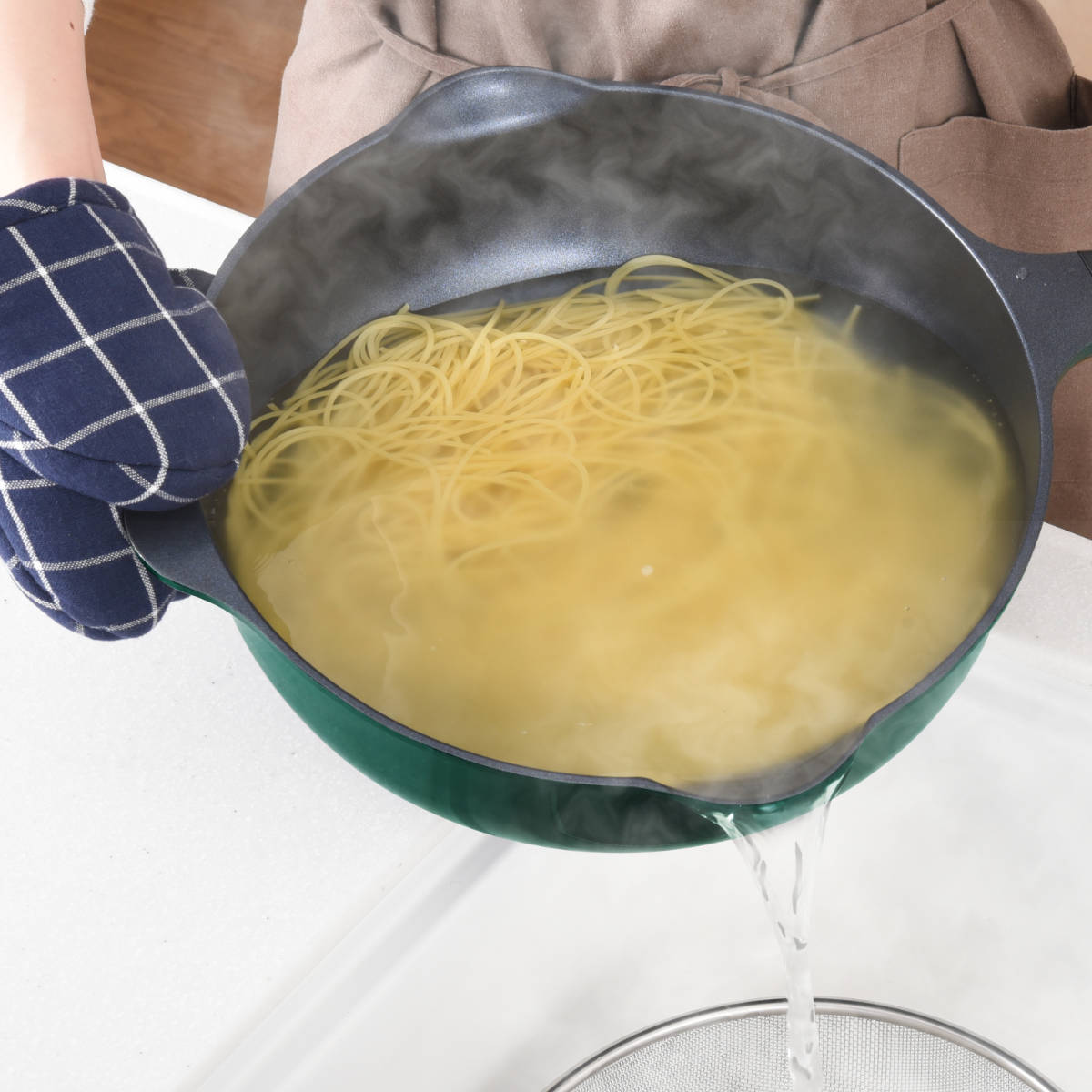 ハンドルの反対側に補助取っ手付きです。茹で汁を流す際に両手でしっかり持てて便利です。