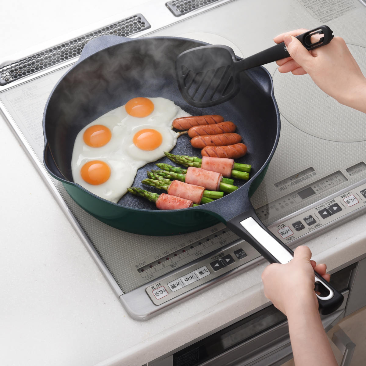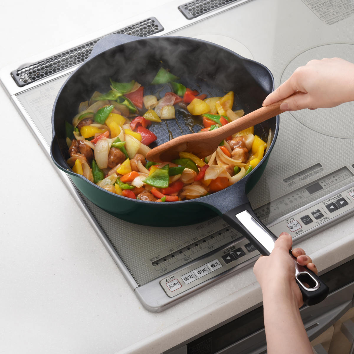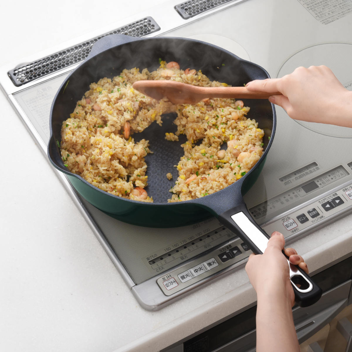 | 材質 | 本体:アルミニウム合金(内面/ふっ素樹脂塗膜加工、外面/焼付塗装) 外底面:鉄(溶射加工) ハンドル:フェノール樹脂 |