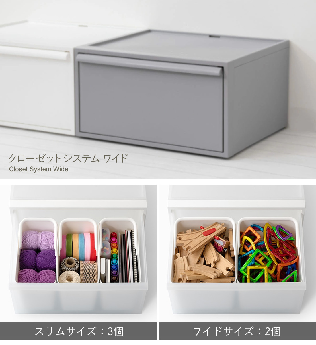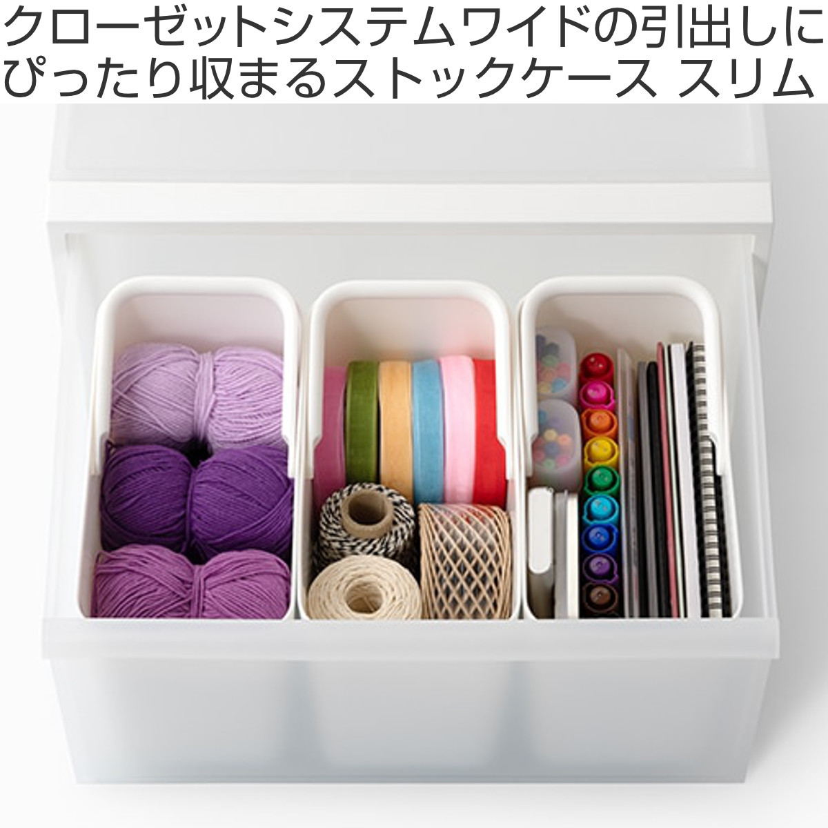 ストックケースは『クローゼットシステム ワイド』の引き出し内にぴったり収まるサイズ設計。スリムは3個、ワイドは2個が気持ちいいほどジャストフィットします。引き出し内の仕切りとしてはもちろん、小物の小分け収納にも使いやすく、使い方の自由度が高いのも魅力です。