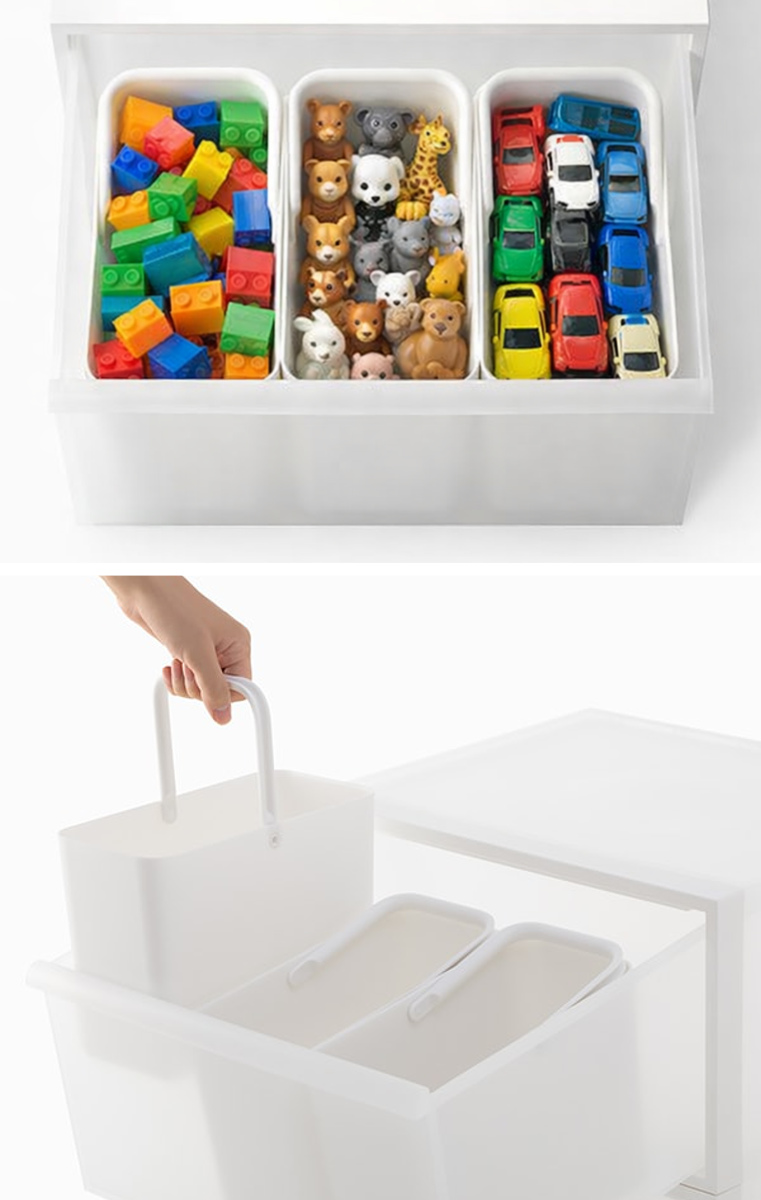 「自分で選ぶ → 運ぶ → 片付ける」の流れを自然につくりやすく、お子様のお片付け習慣のサポート役としても最適の収納アイテムです。