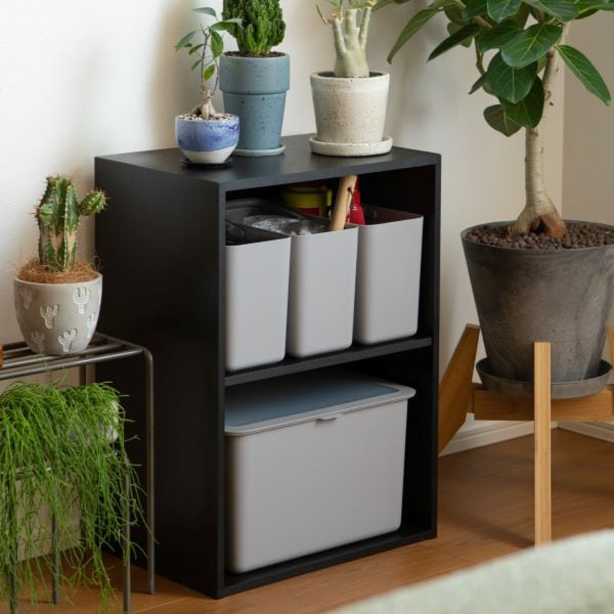 ストックケースは、カラーボックス1段に3個きれいに収まるサイズ感。オープンスペースでも違和感なく置けるスリムでシンプルなデザインは、リビングなど目につく場所でも自然になじみます。日常使いのアイテムを入れても生活感が出すぎず、手の届く場所に気軽に置いておけます。