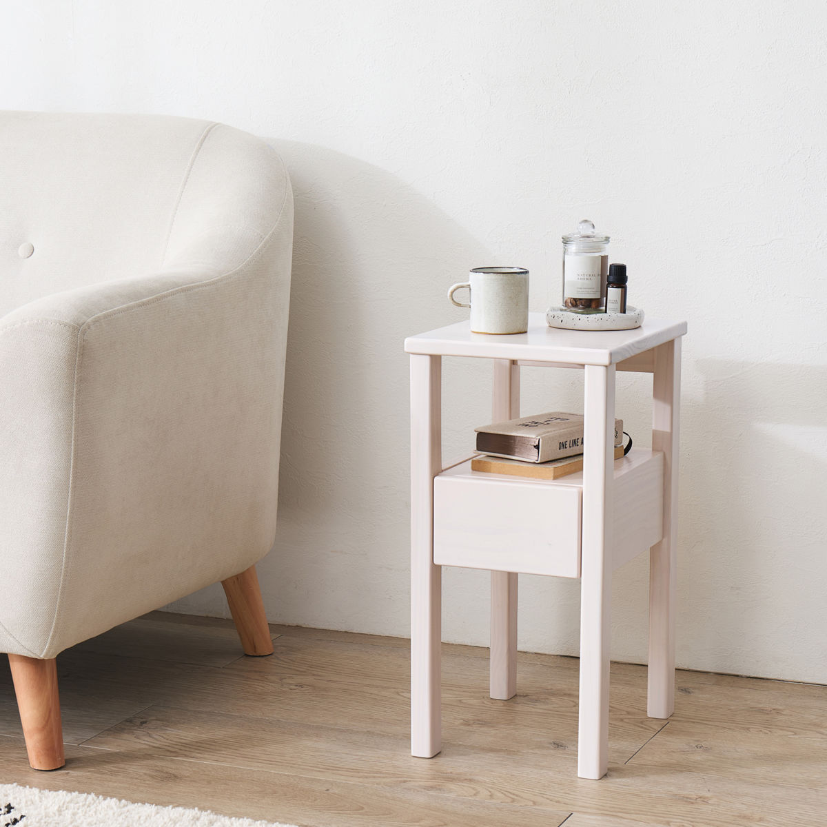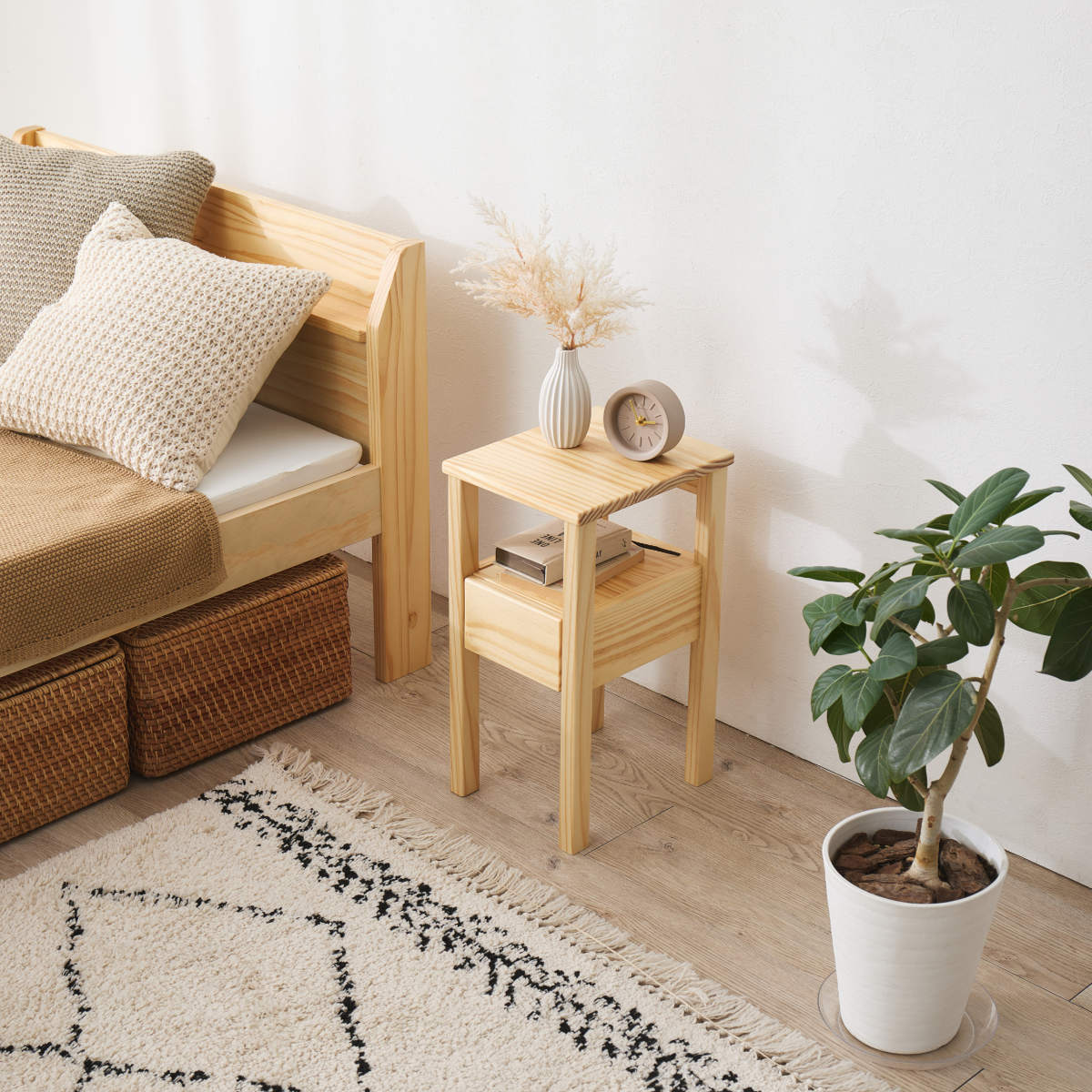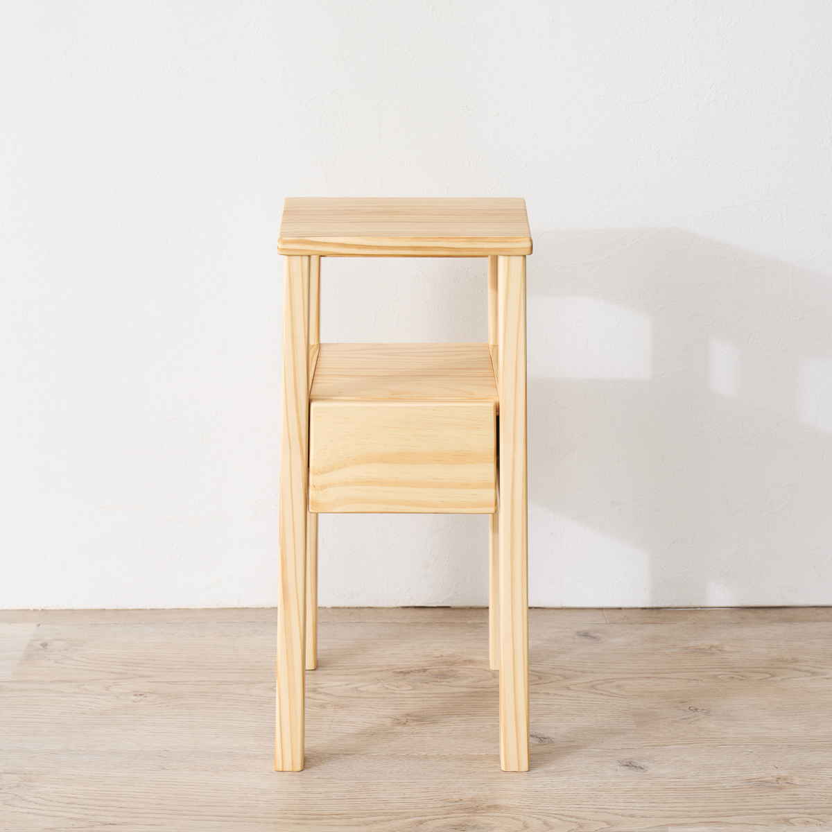 明るくやさしい色合いのパイン材を使用したサイドテーブルです。木目の表情を活かしたシンプルなデザインが、暮らしに落ち着きを与えてくれます。家具や床材との相性も良く、毎日の暮らしに自然に馴染みます。