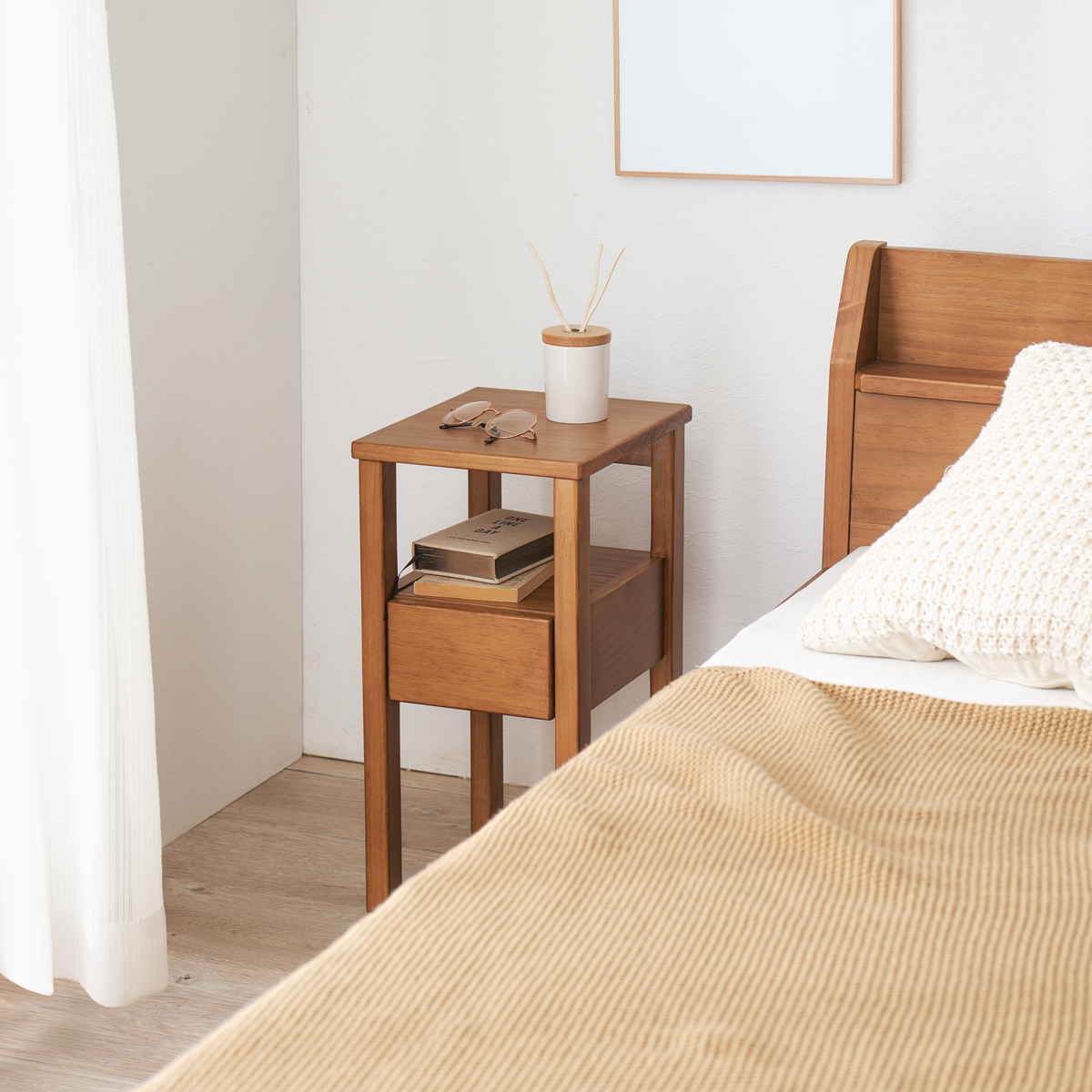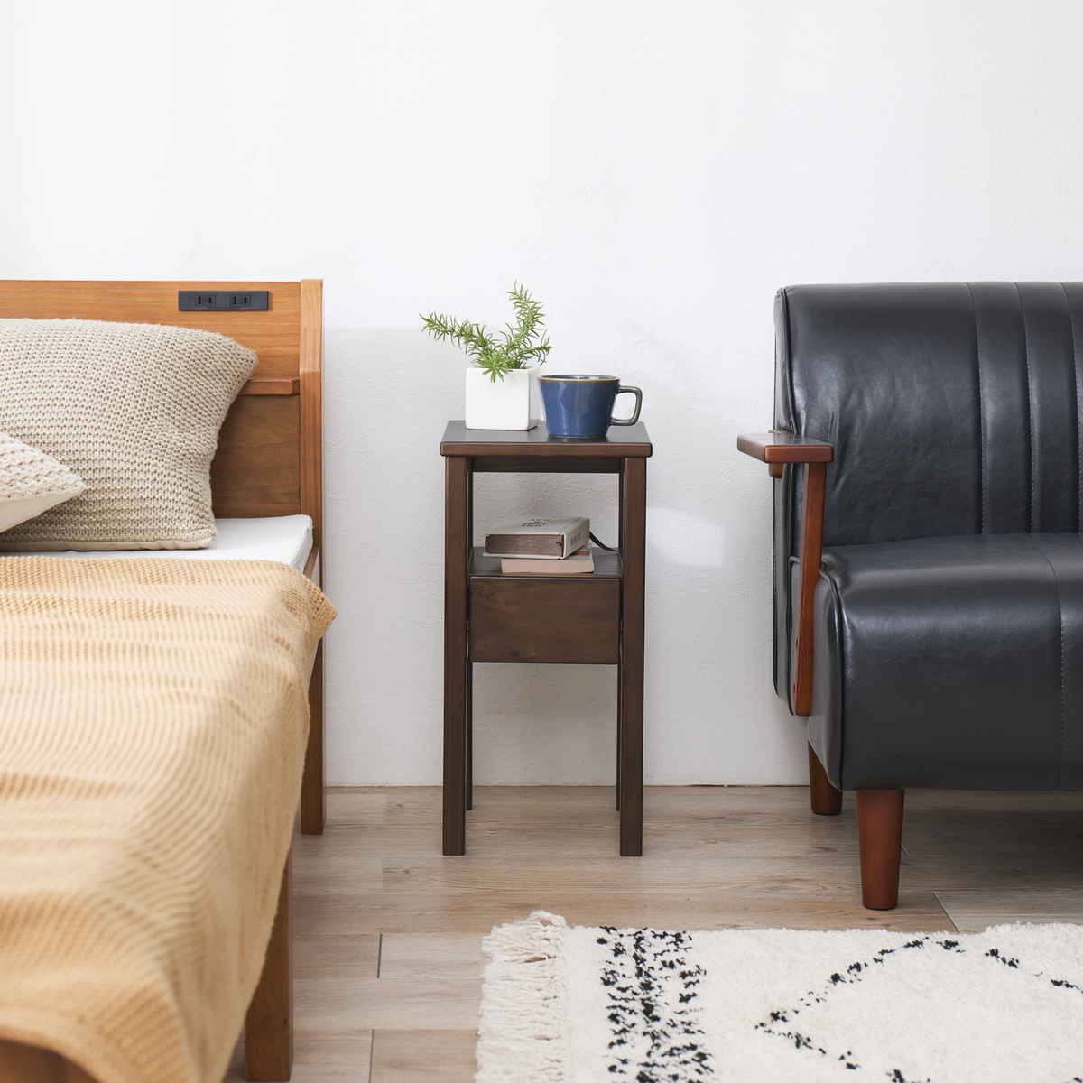 幅約25cmの省スペース設計で、置く場所を選びません。ベッドサイドやソファ横など、限られたスペースにもすっきり収まります。