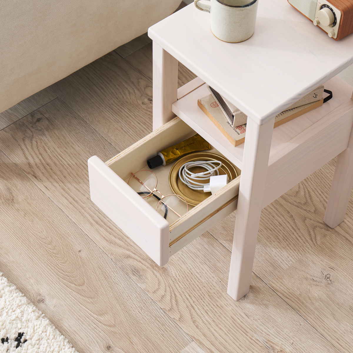 スマートフォンや眼鏡、読みかけの本など、寝る前に使う小物の置き場として便利です。必要な物を手の届く場所にまとめられます。