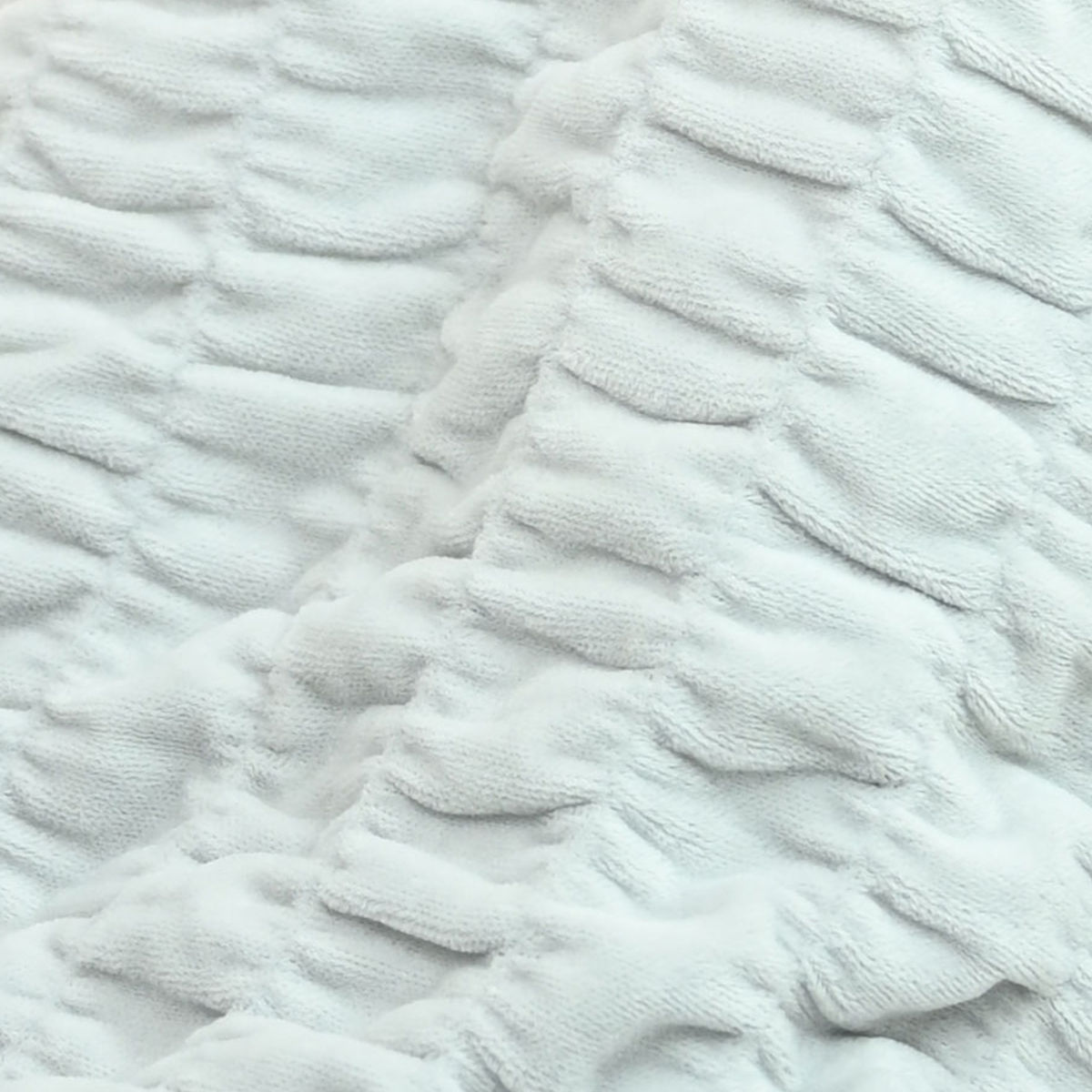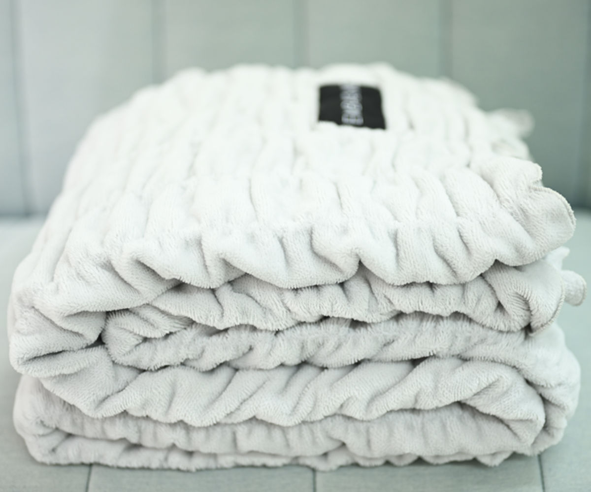 伸び縮みする糸を織り込んだポコポコとした形状が特徴のシュリンク織です。パイルだけでなく凸凹の中にも空気を含むため、程よい暖かさが保たれます。見た目よりも軽く、ふわっとしたフィット感です。