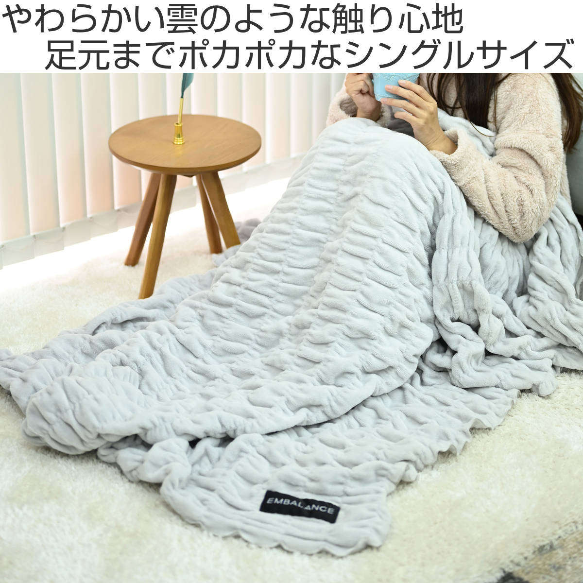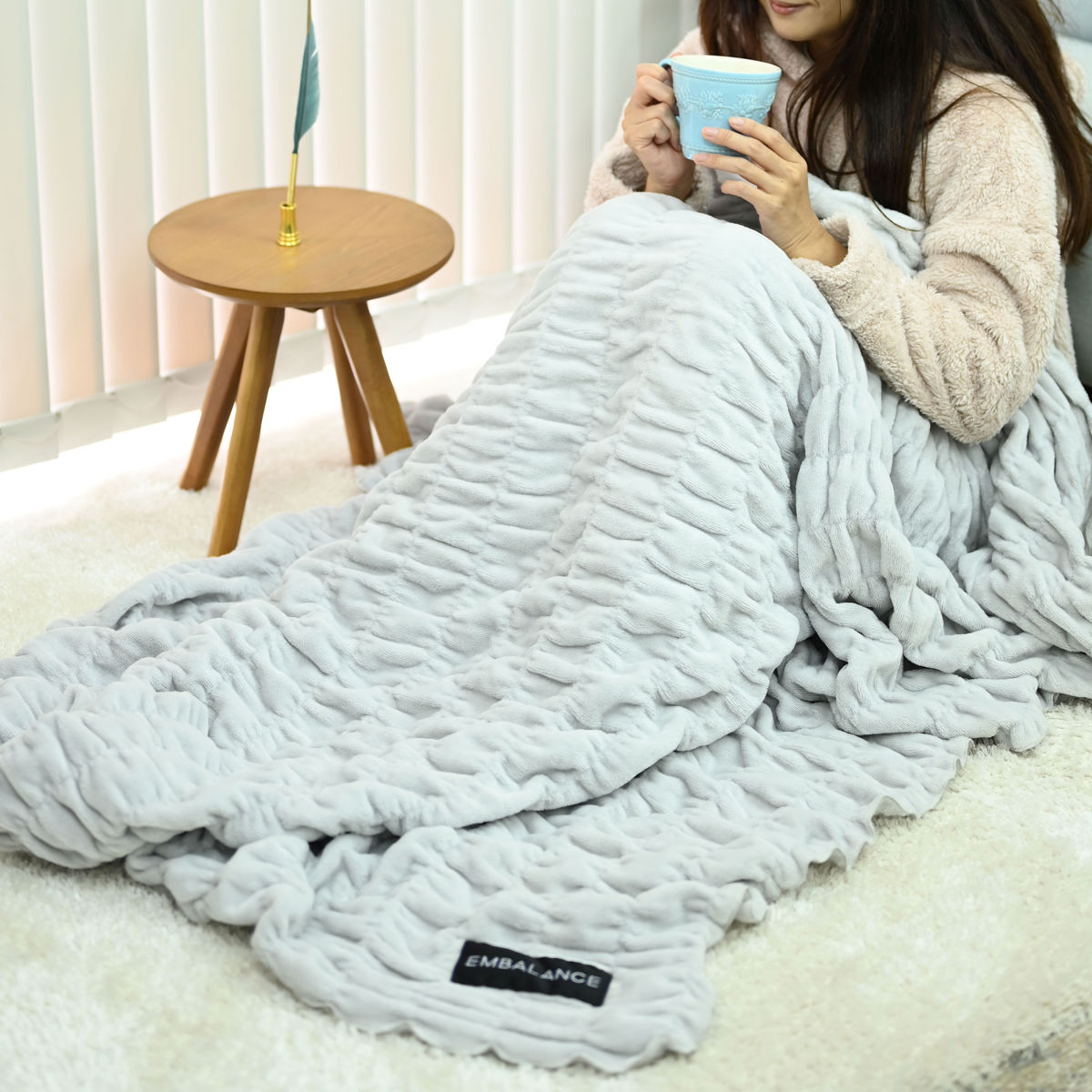 あたたかくてやわらかい、雲のような触りごこちのブランケットです。織物の産地として有名な、和歌山の高野口で一枚一枚丹念に織られた逸品です。ひざ掛けとしてリビングで使ったり、肩や腰まわりを温めたり、さまざまなシーンで重宝します。
