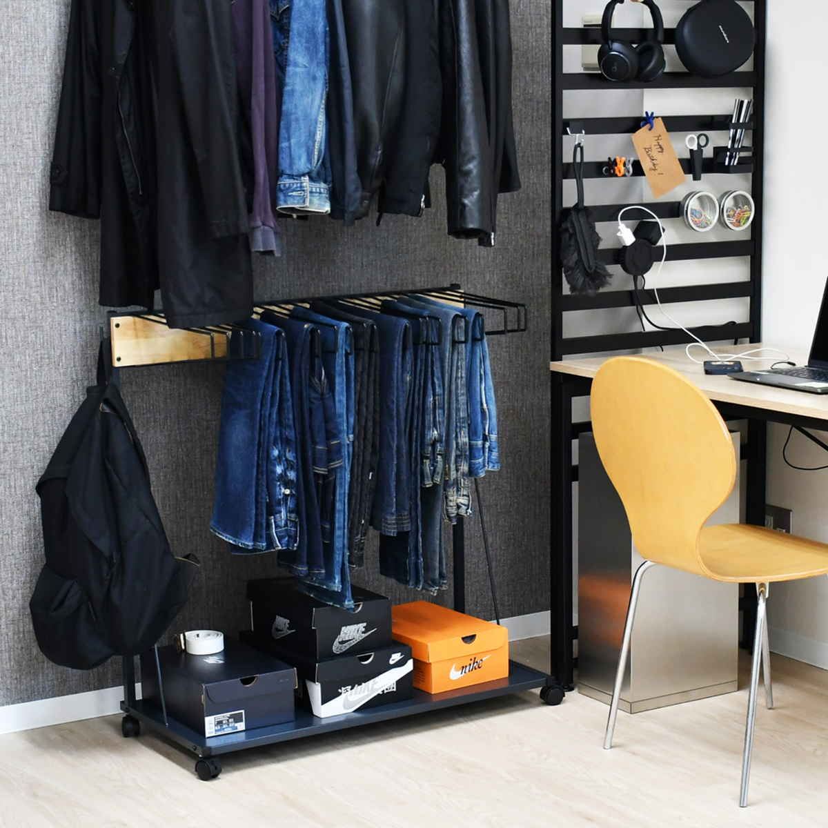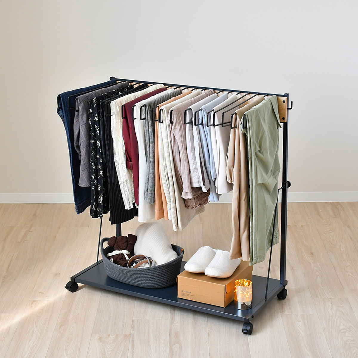 ジーンズはもちろん、スラックス・ワイドパンツ・スカート・タオル掛けとしても活躍します。1台で多用途に使える、頼れる収納インテリアです。