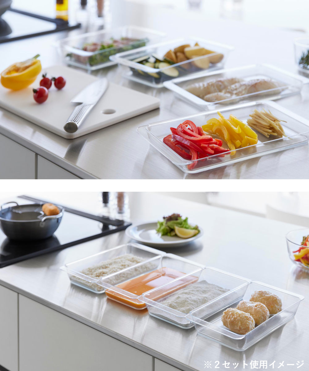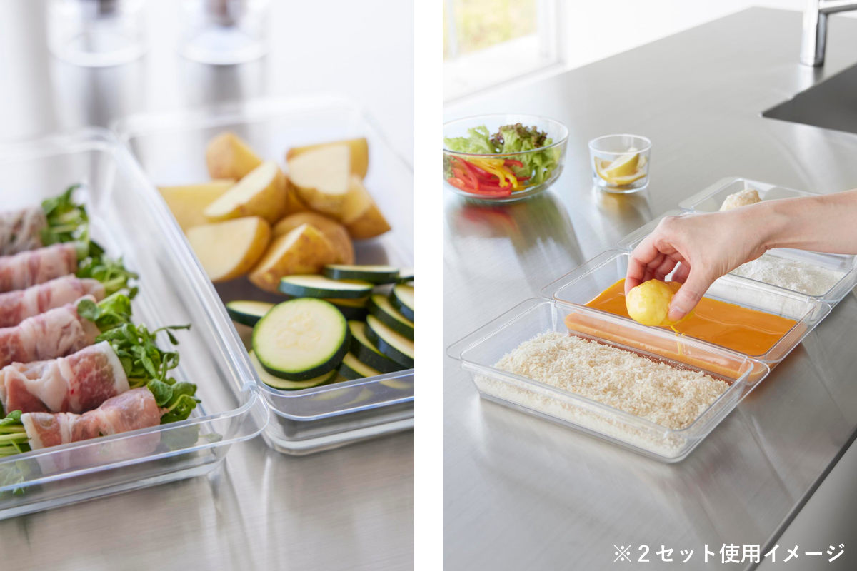 2個連結させて使用すると揚げ物の衣付けもスムーズにできて、調理台を汚さずに食材を移せます。