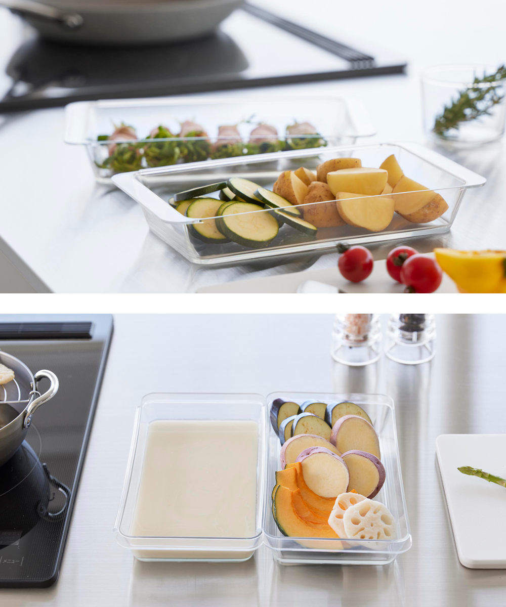 連結ができて便利な深型の調理トレー2個組です。食材の色移りがしにくく、使いやすい透明のデザインです。カットした野菜、下味を付けたお肉やお魚を入れて料理の下準備に便利に使えます。