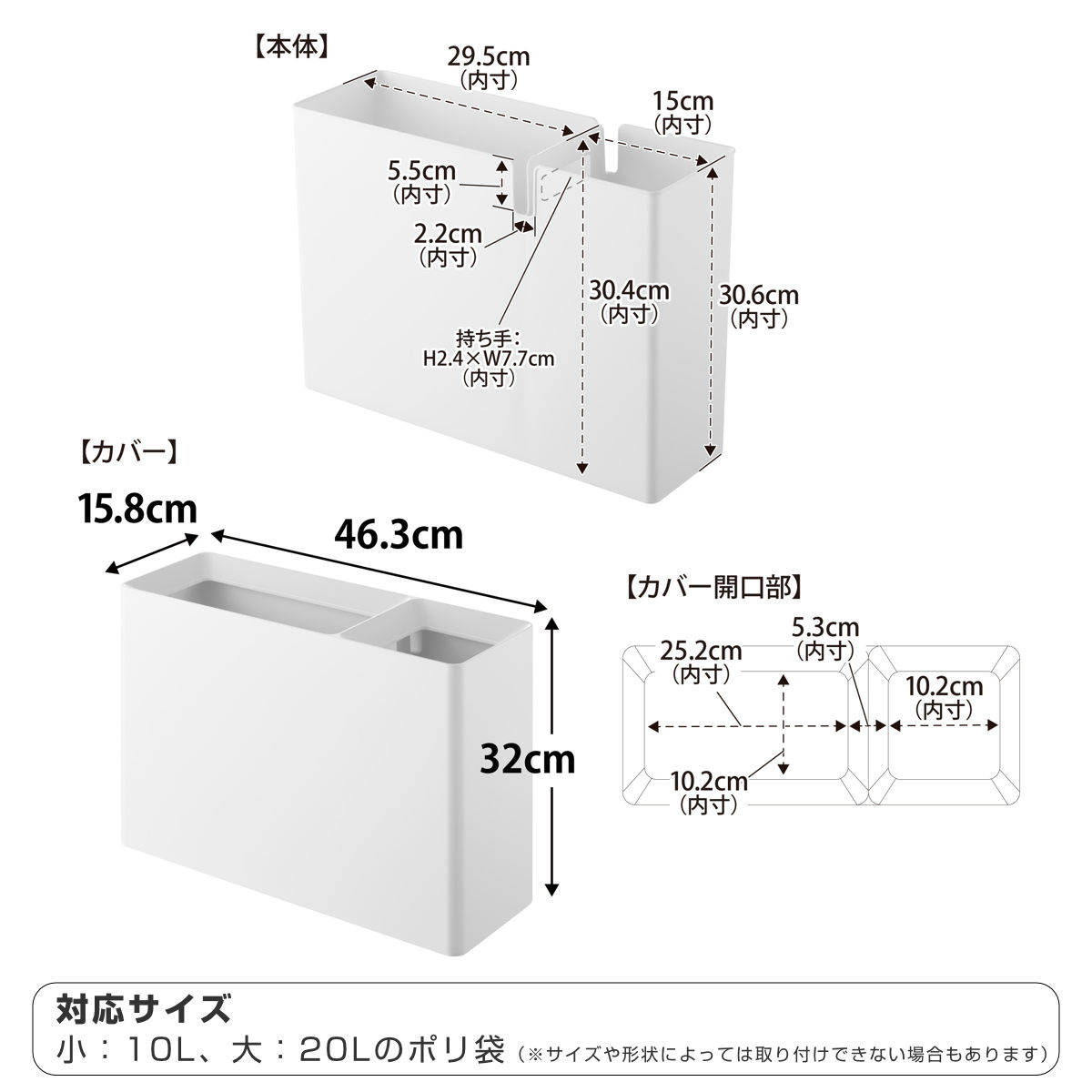 | 対応サイズ | 小:10L、大:20Lのポリ袋 ※ポリ袋のサイズや形状によっては取り付けできない場合もあります。 |