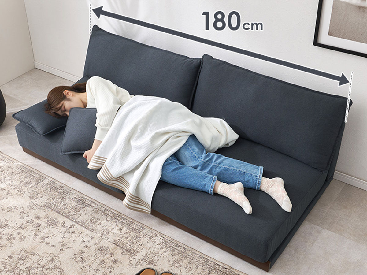 横になってくつろげる、約180cmの広々とした座面。脚までしっかりおさまる、ごろ寝にぴったりのサイズ感です。