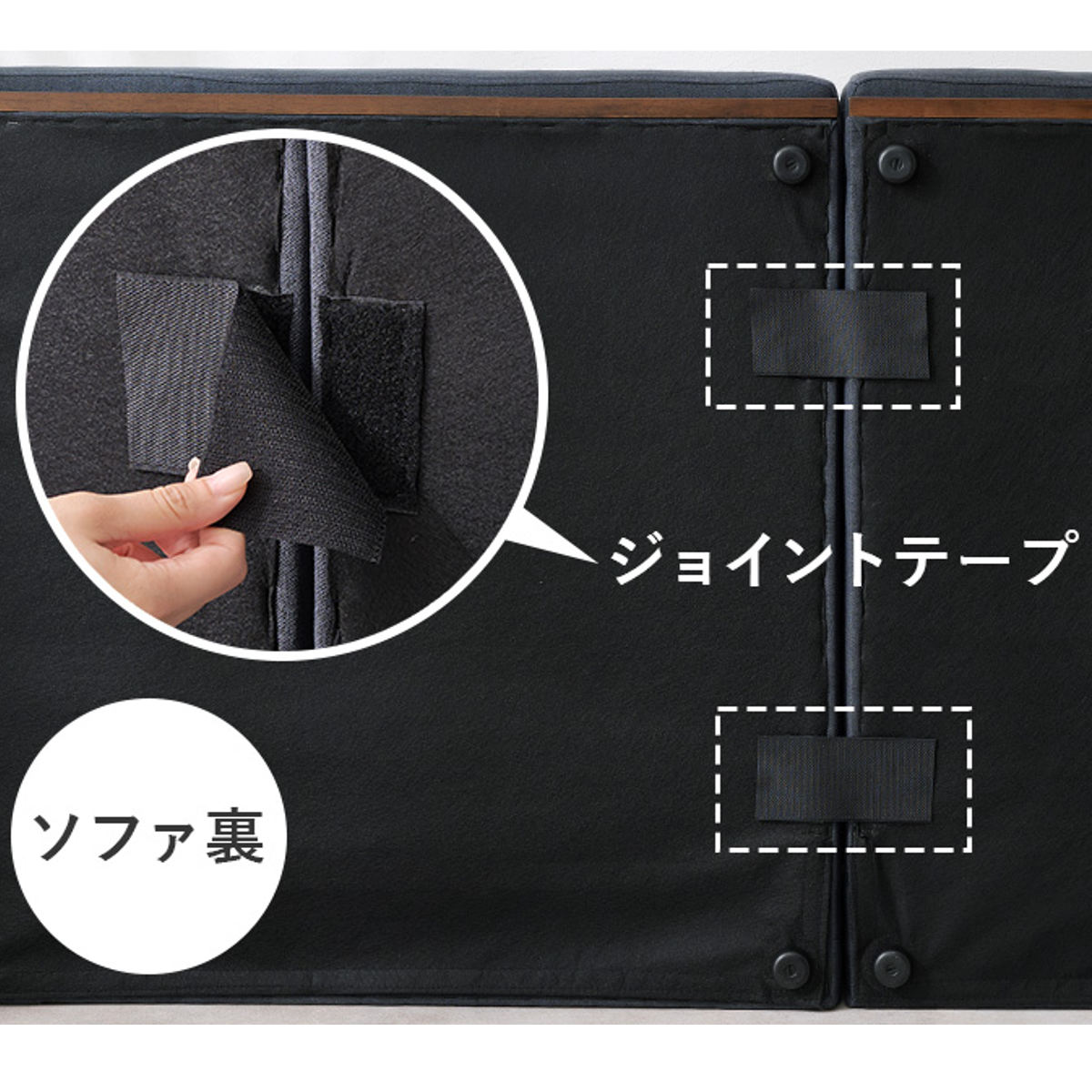 ソファ裏にはジョイント用のテープを付けることが可能。ソファ同士がズレないように連結できます。