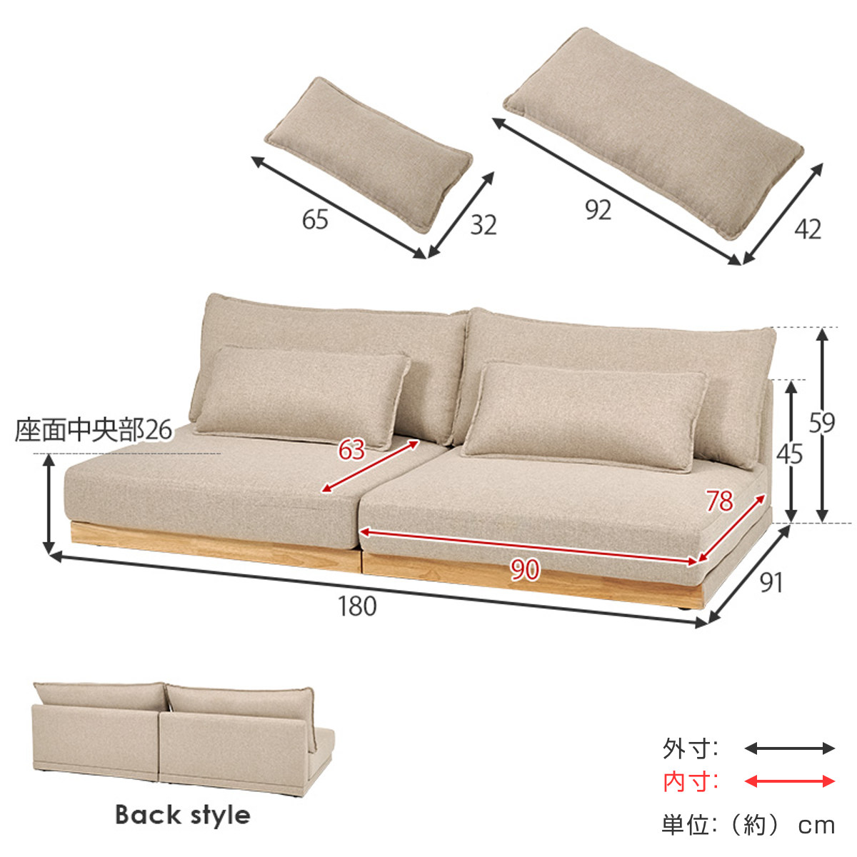 | サイズ | 約 幅180×奥行91×高さ59(cm) 座面高:約 26(cm) |